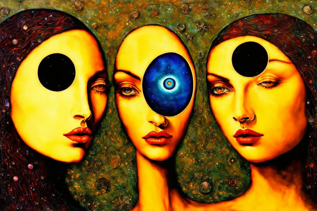 Three artistic faces with cosmic and celestial motifs; the central figure has an eye with a spiraling galaxy, others with dark circles.