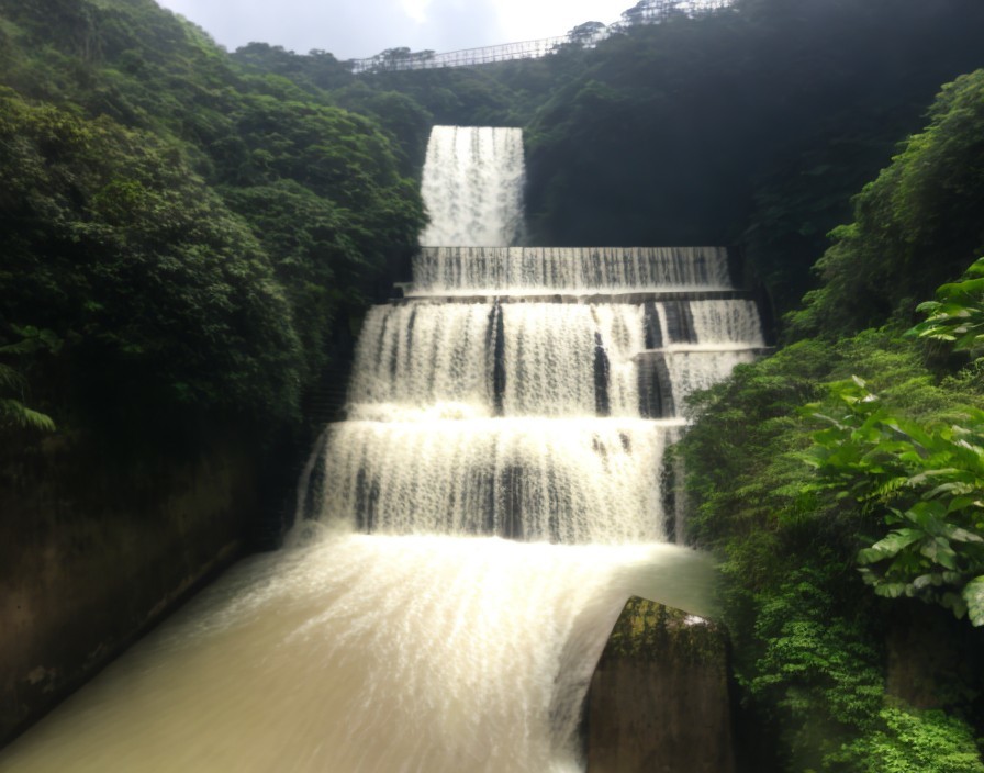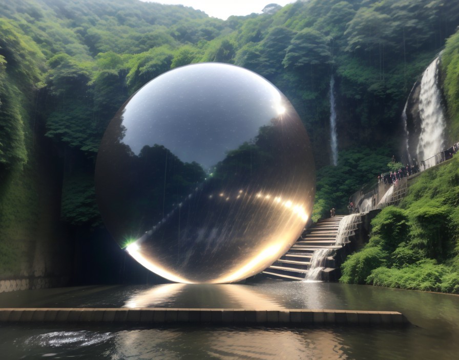 A person stands before a massive, reflective sphere in a serene, green valley with a waterfall in the background, evoking a sense of wonder.