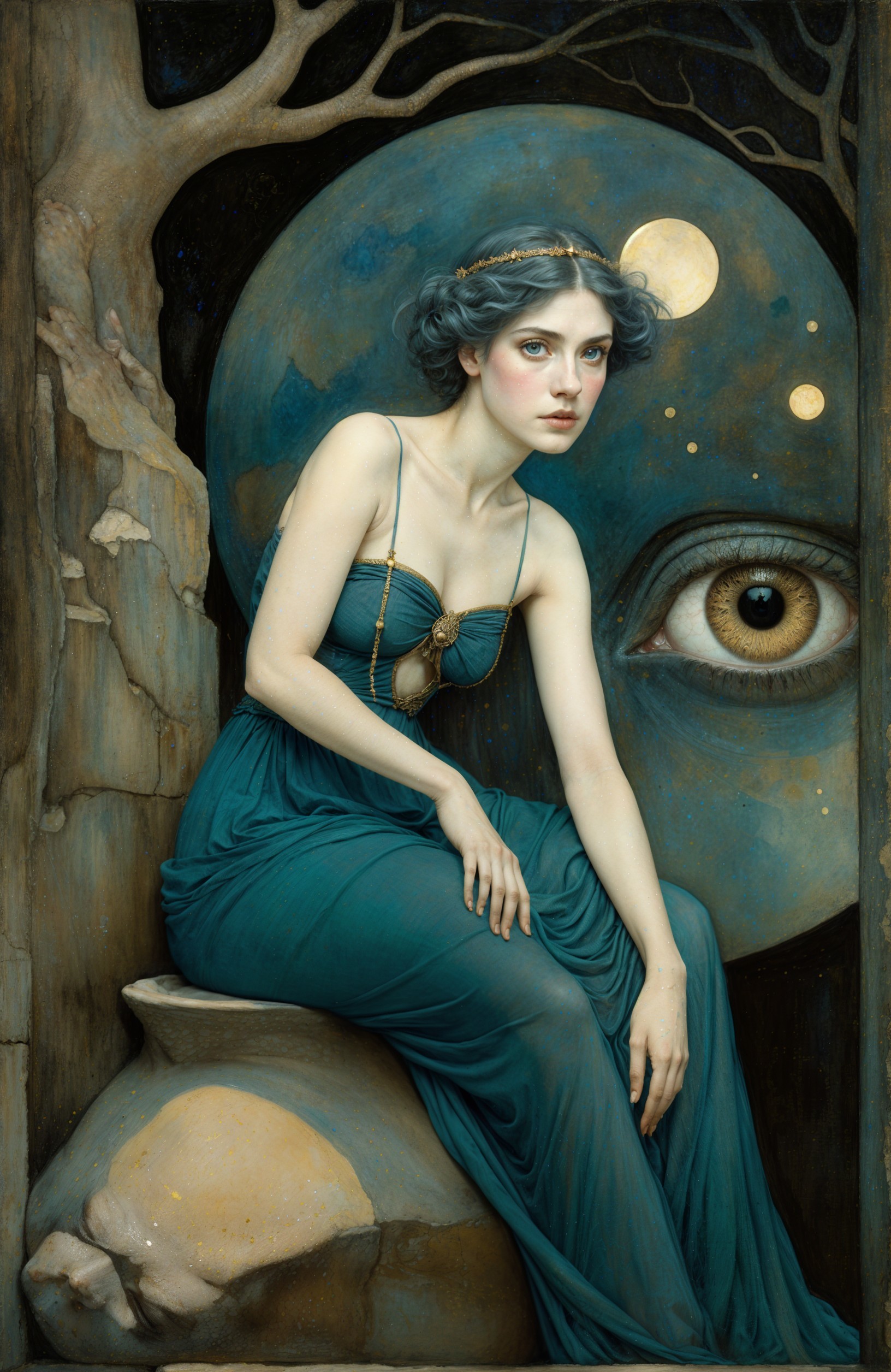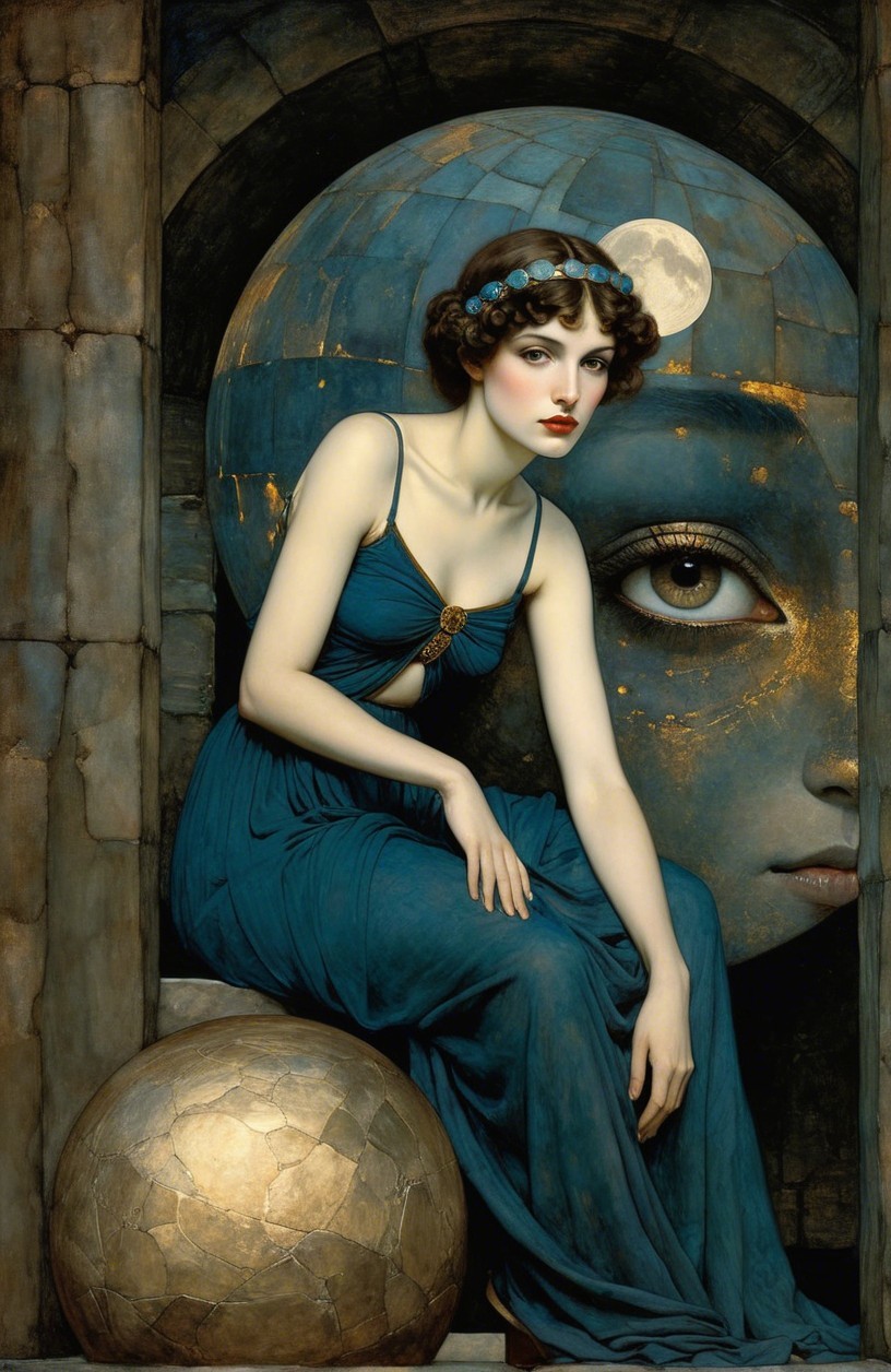 A young woman in a flowing teal dress sits gracefully on a round stone, adorned with a floral crown. She gazes thoughtfully, framed by a circular stone backdrop, exuding elegance and poise.