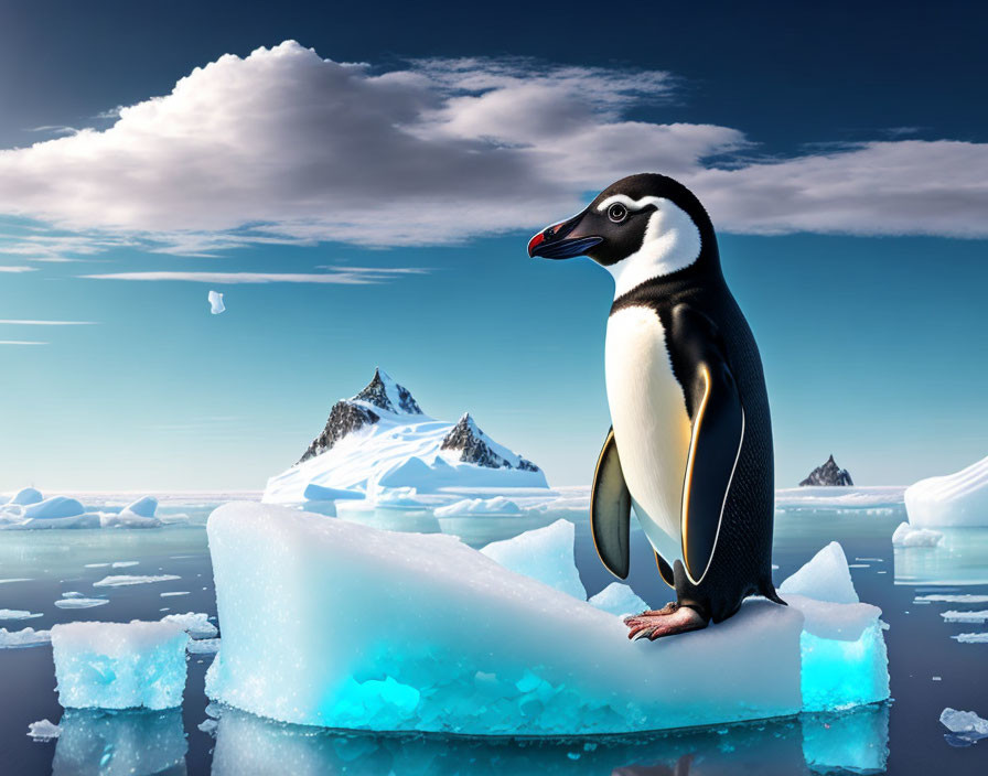 A Humboldt Penguin on a floating ice floe, antartic sea, sunny weather, some clouds