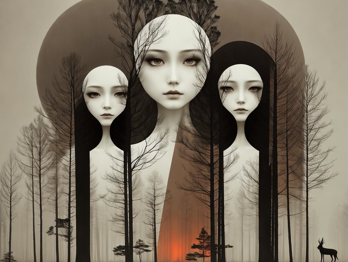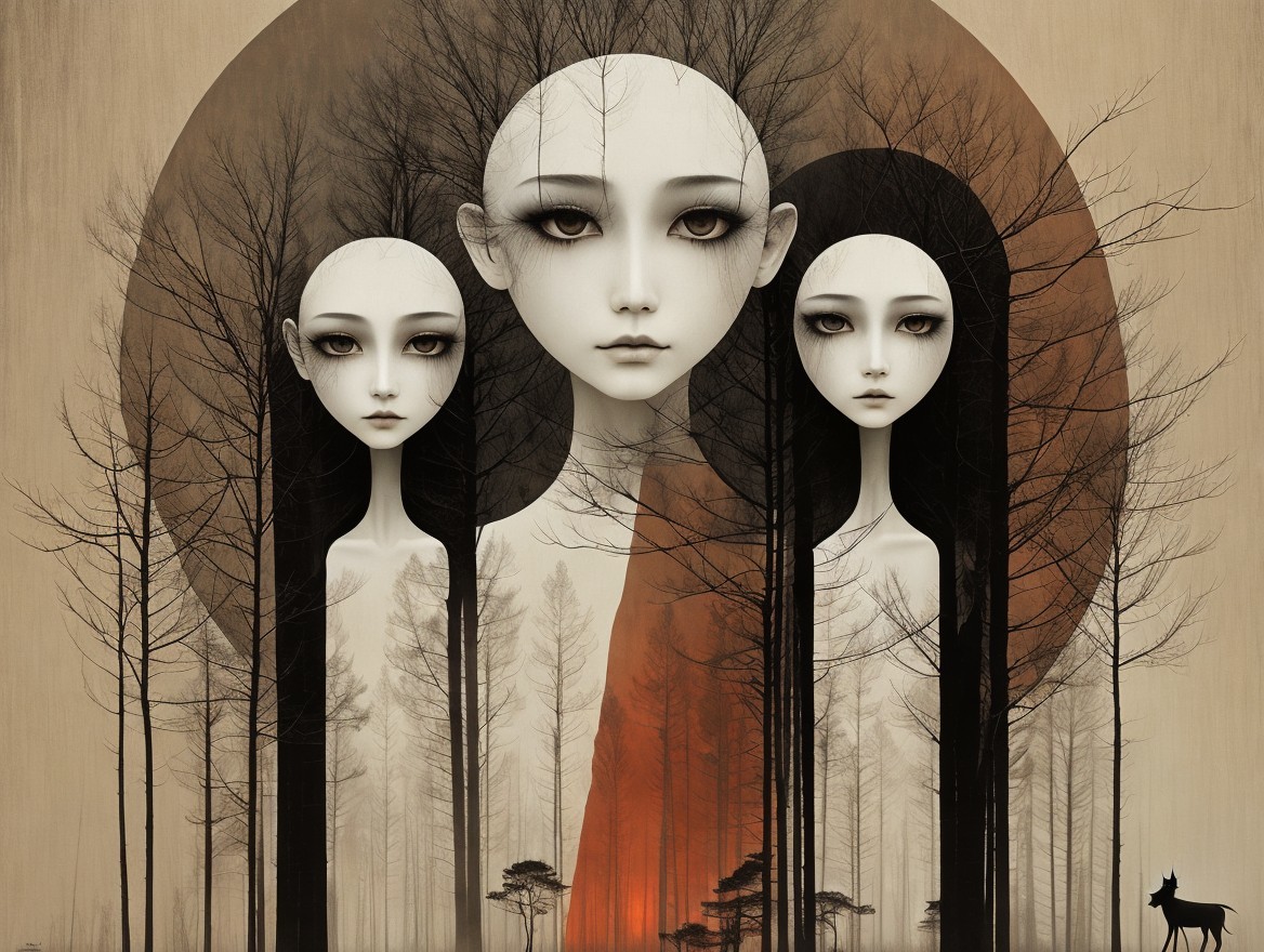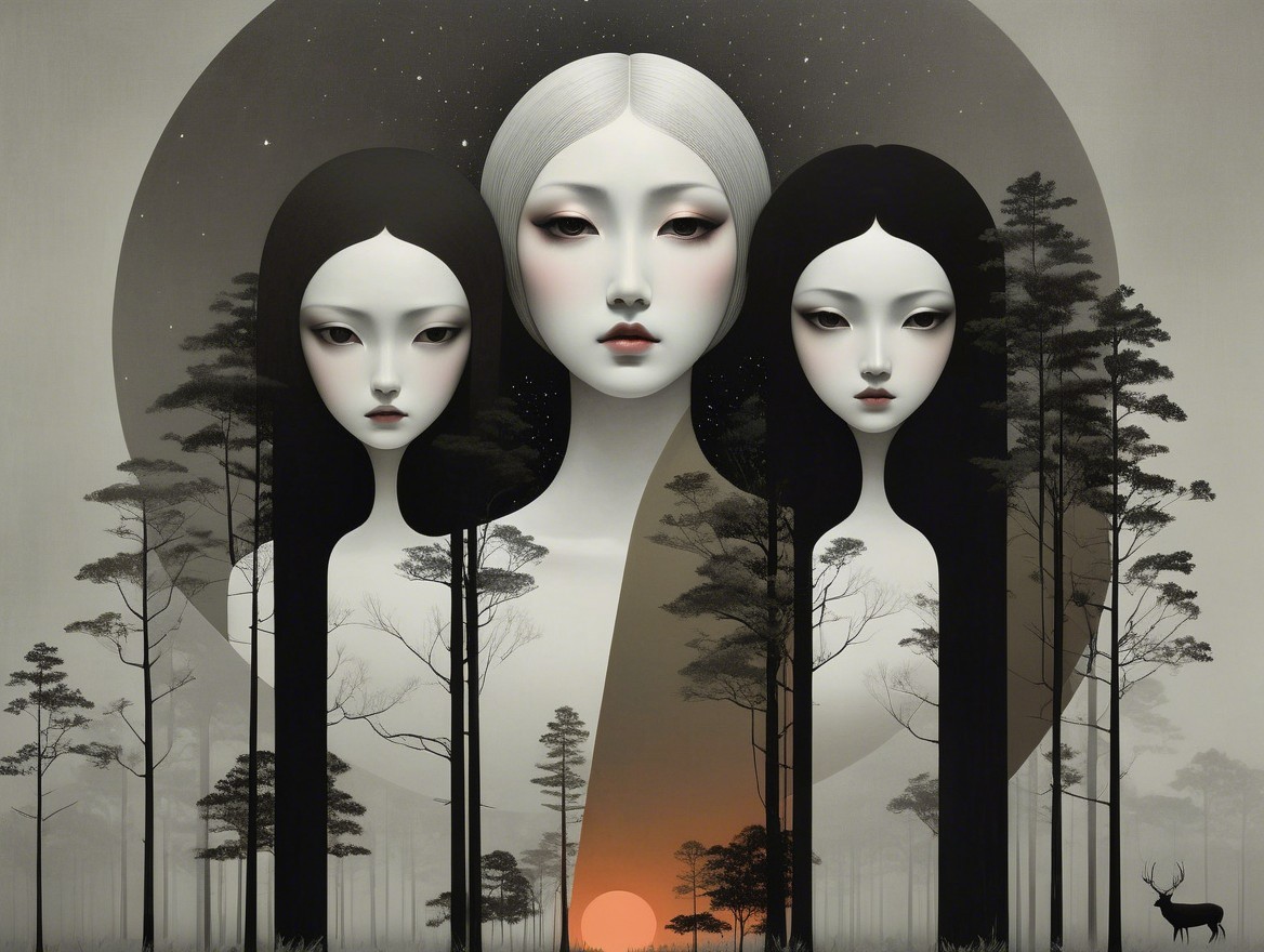 The artwork features three ethereal figures with pale skin and dark hair, positioned on pedestals. They have large, expressive eyes, surrounded by soft dandelions, creating a mystical atmosphere.