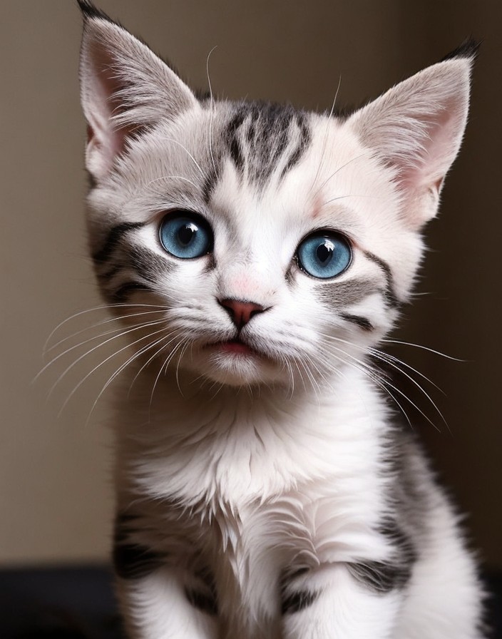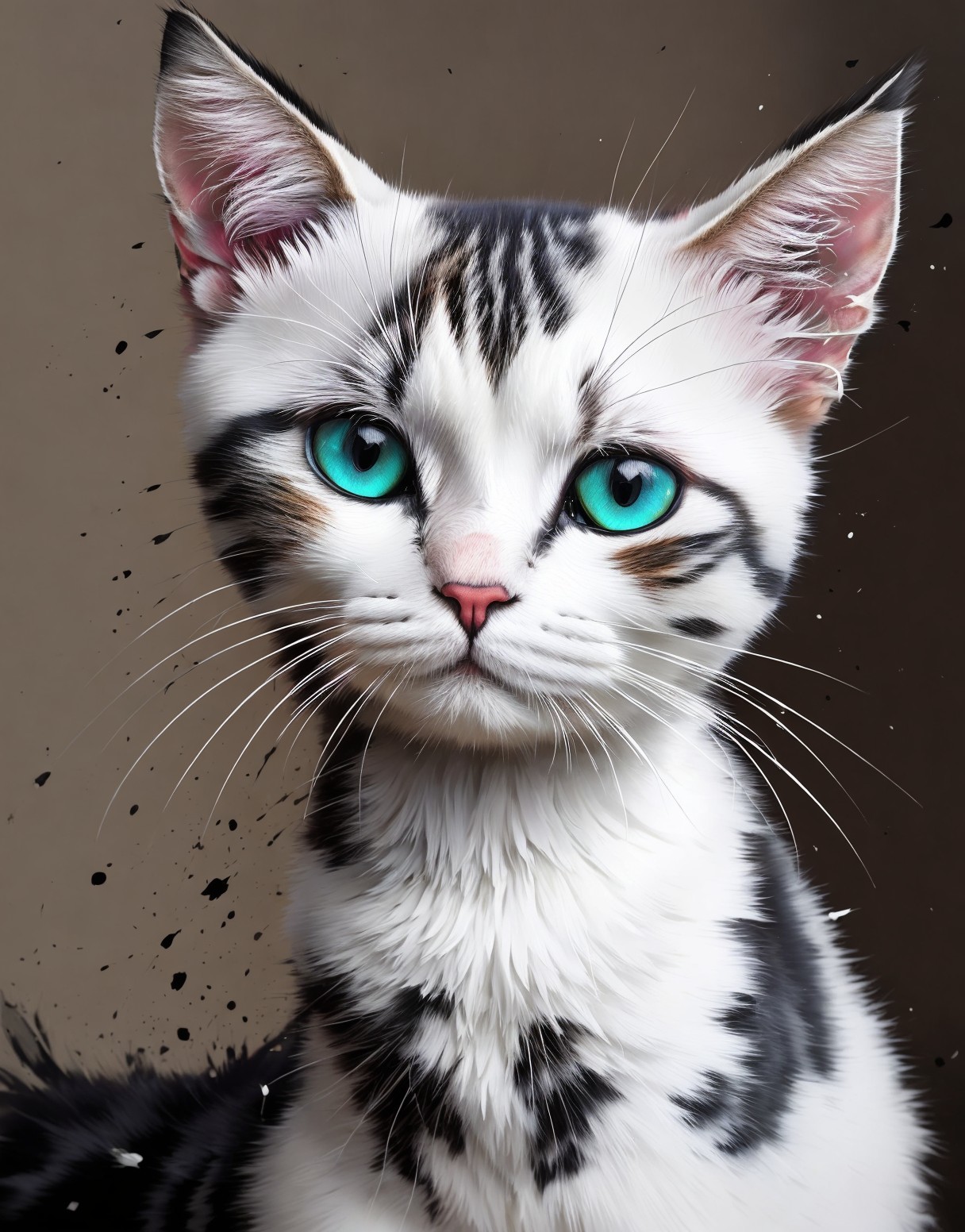 A beautiful, artistic portrait of a cat with striking blue eyes and a mix of white and gray fur. The background features abstract splashes of color that enhance its charm.