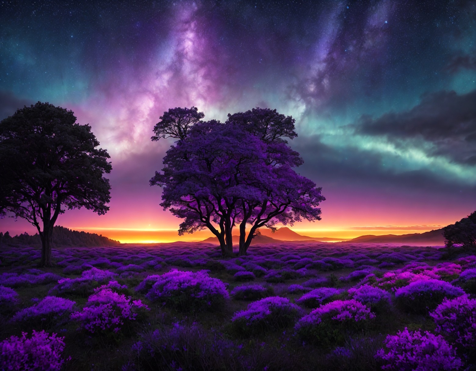 A breathtaking nightscape with vivid purple flowers, silhouetted trees, and a dazzling aurora borealis in the starry sky.