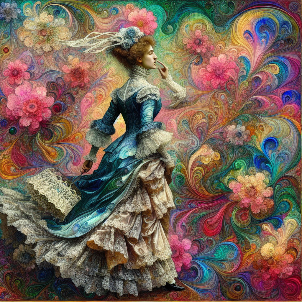 A serene figure with flowing hair adorned with vibrant flowers. Her gentle expression and intricate jewelry complement a richly colored background, evoking a sense of beauty and tranquility.