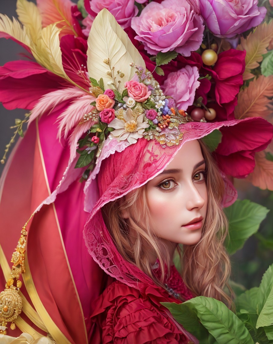 A woman adorned with an elaborate floral hat and a red cloak gazes at the viewer, embodying a romantic, fantastical aesthetic.