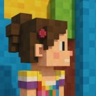 A vibrant anime illustration features a young woman in profile, surrounded by colorful geometric shapes and floating petals, while two other figures appear in the background, enhancing the lively scene.