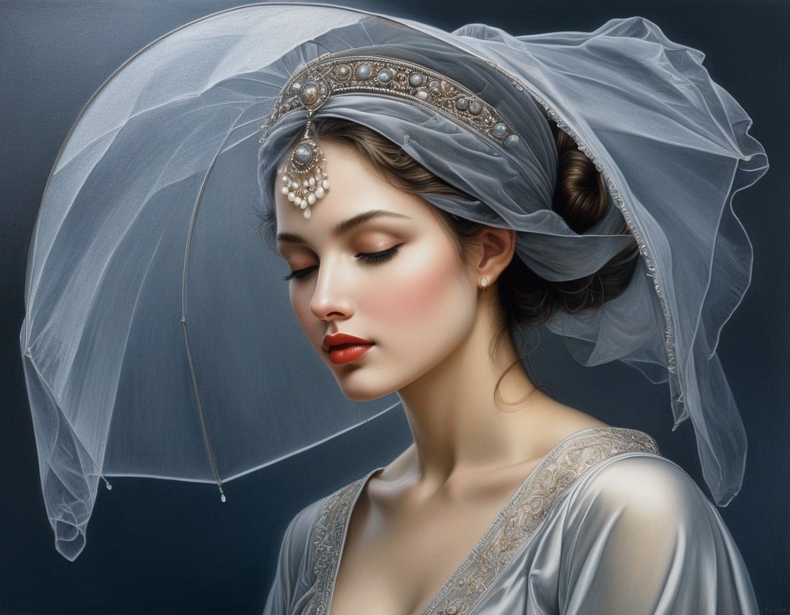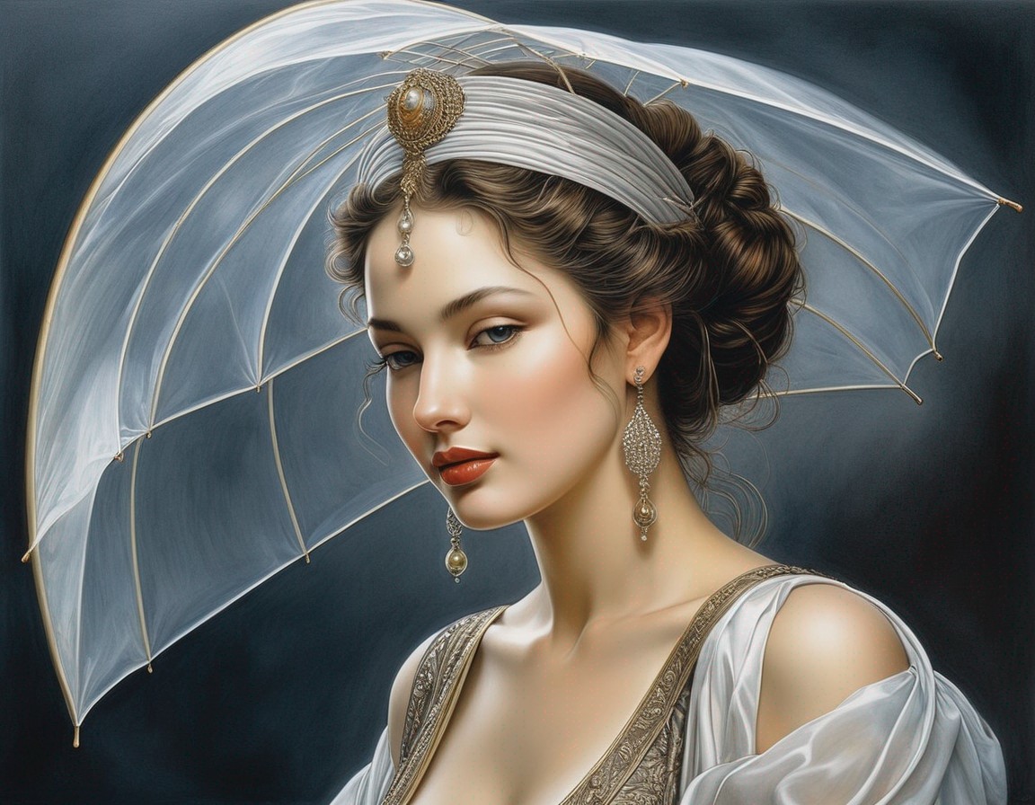 A regal woman with a crown and earrings holding a spherical object, with a full moon in the background.