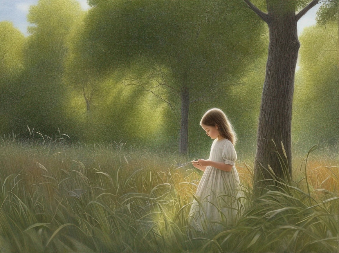 A girl in a white dress stands in a sunlit field, surrounded by tall grass and trees, in a serene, pastoral scene.