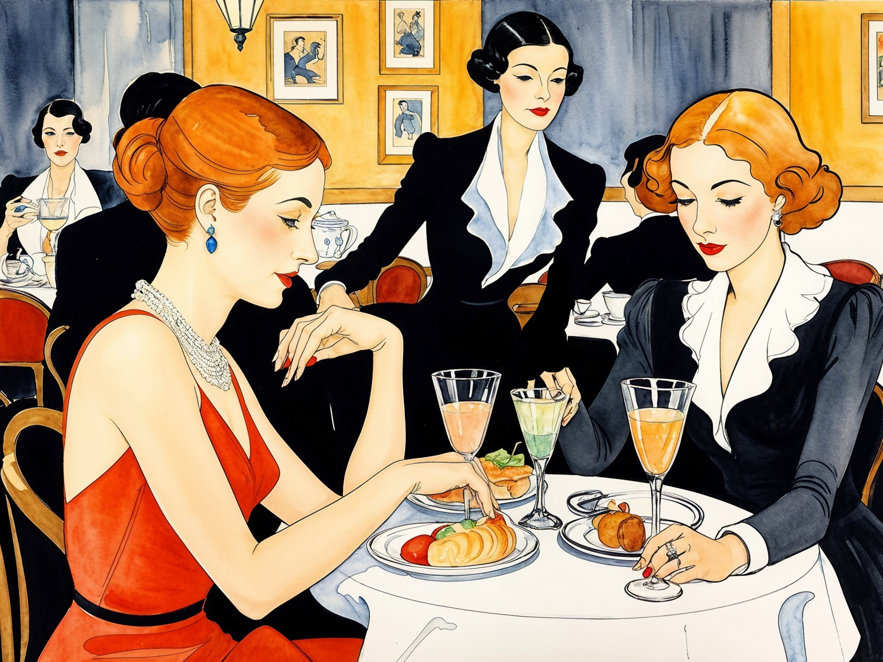 Create a watercolor and ink painting depicting 1930's era sophisticated (anatomically correct) ladies at lunch at a cafe. In the style of Itzchak Tarkay and Toulouse de Lautrec. Use primary colors which occasionally bleed into one another (wet on wet technique). Outline figures in black ink.
