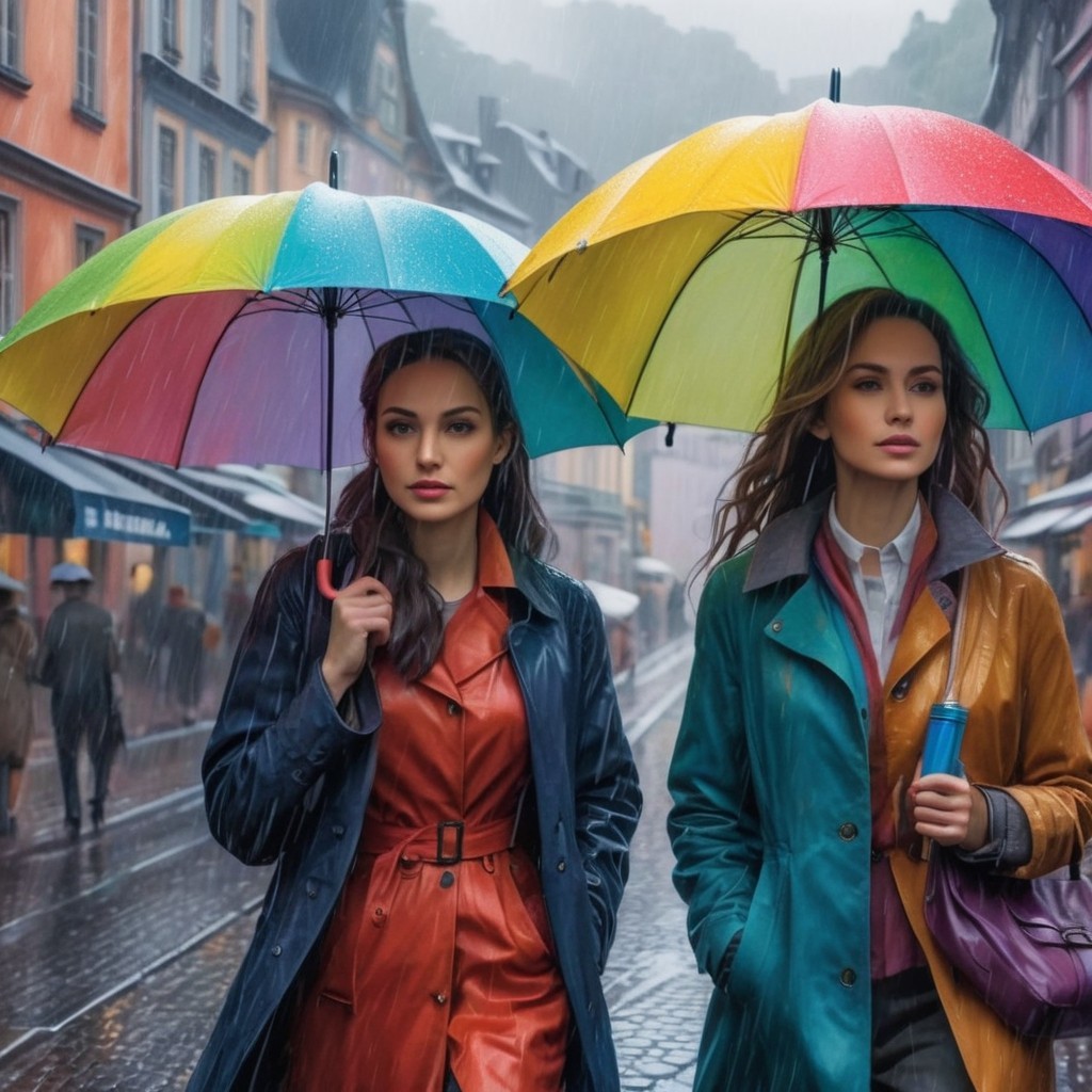 Two women holding colourful umbrellas walk on a rainy, cobblestone street in Heidelburg, Germany