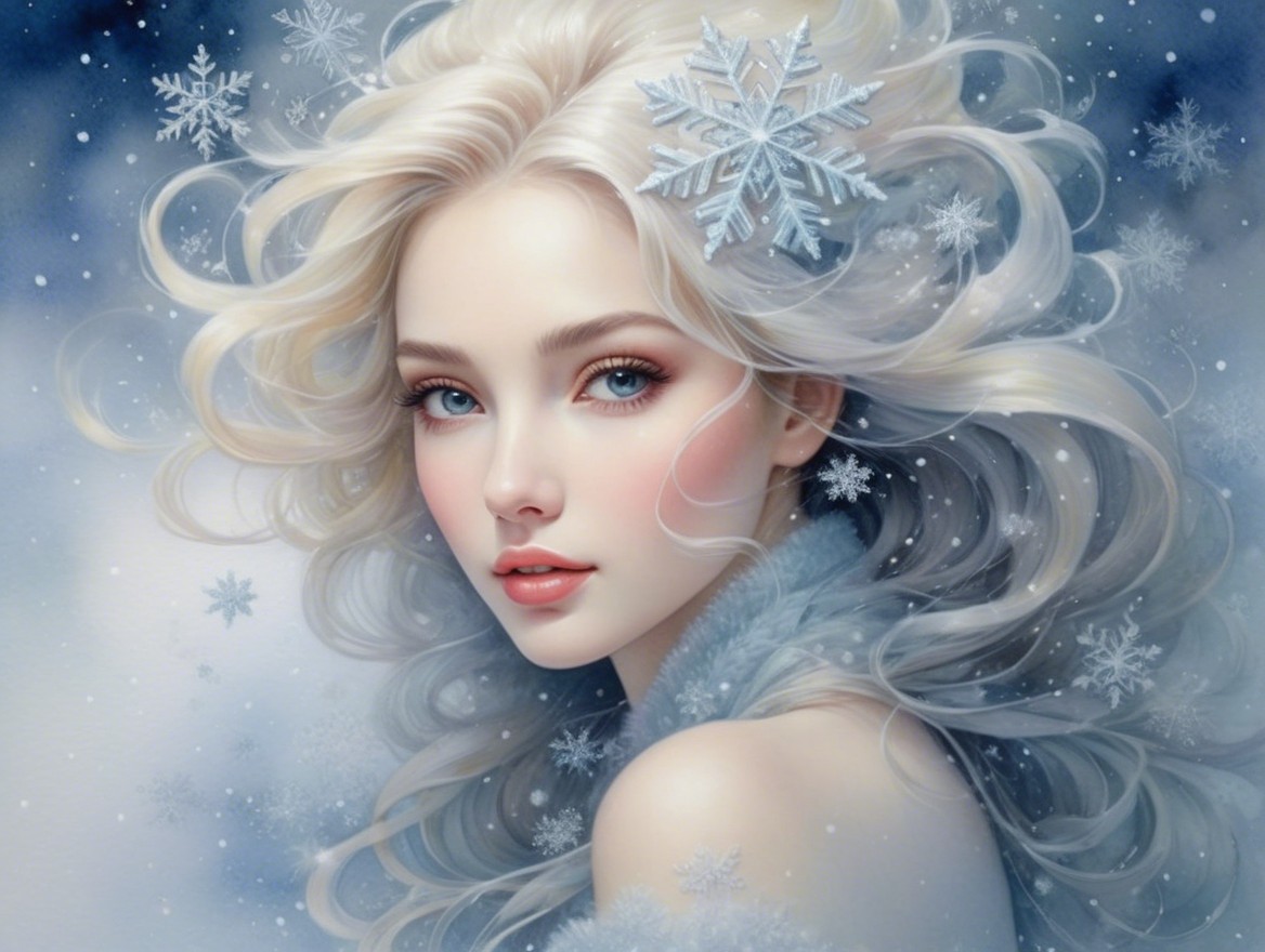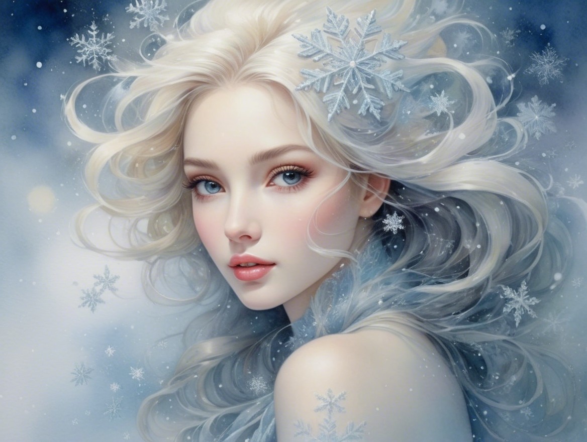 A beautiful, ethereal woman with flowing silver-blonde hair adorned with snowflakes, gazes softly. A wintery background with gentle snow adds to the enchanting atmosphere.