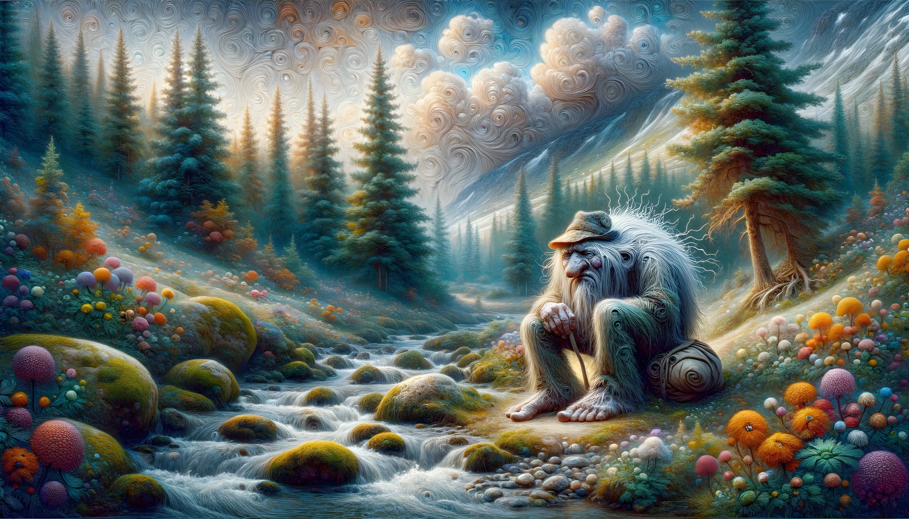 A bearded traveler rests by a stream in a mountainous, forested landscape, as the sun breaks through clouds above.