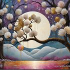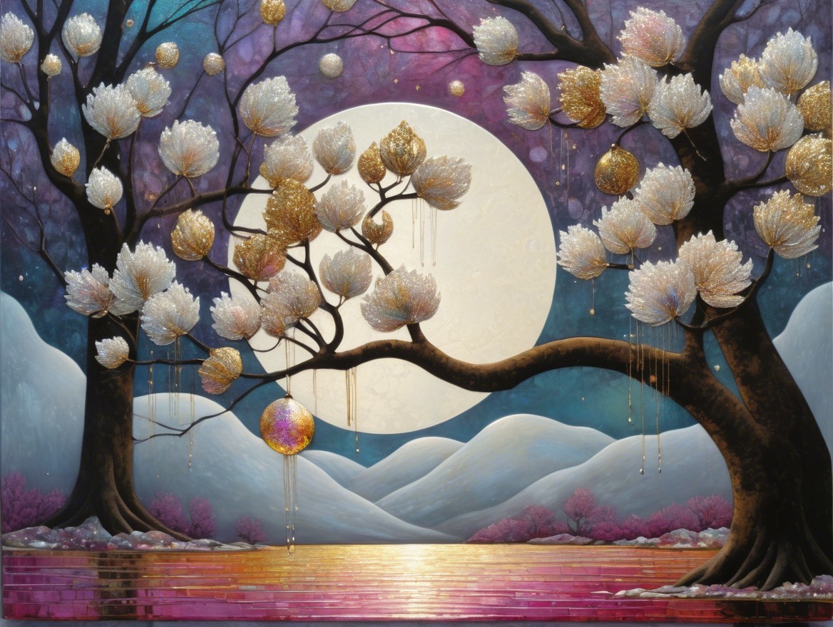 A serene landscape features shimmering white trees adorned with golden ornaments, reflecting a glowing full moon in a tranquil lake, surrounded by gentle hills and soft pink foliage.