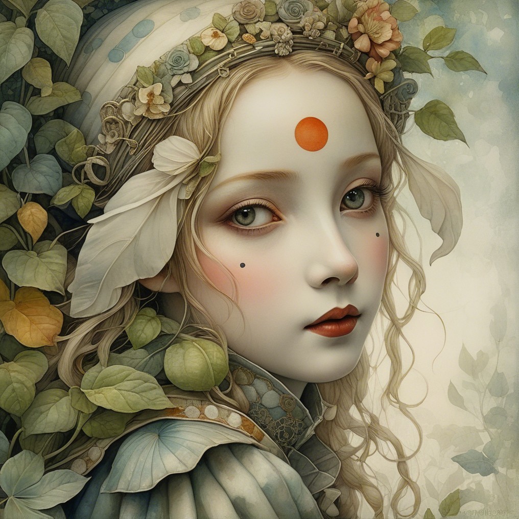 Close up, impish amused beautiful Japanese Pierrot in a garden labyrinth, in the style of Alexander Jansson. by Catrin Welz-Stein, Michael Parkes