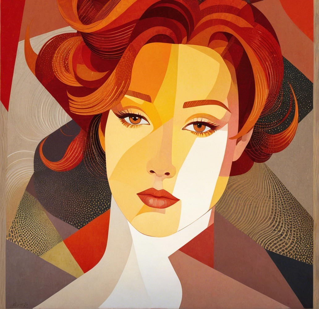 Prompt: Stylized woodblock print, abstract Portraiture, cubistic, calligraphic lineage in squiggly lines, tesselated, stippled, abstrastacked-up perspective, juvenile woman with red hair emerging from background, color shapes and spaces, paint splashes, flecks, tesselated, push processing technique, pointillism particles, fractal details, delicate shades of beige and pale red, radiance, sculpted, scruffy, retrofuturistic details by William Bradley, retropunk features in style of brad Kunkle, hues by barclay shaw, contouring outlines by Margaret Keane, lighting by Henri Toulouse-Lautrec, grunge, hatching, intricate hues with textures 1.7, burlesque heroine in style of Overton Loyd and Arlie Opal, scratching and very soft rounded edges, color glitch details, uplifting, plasticity 1.6, luminosity 1.3, overspray of paint details,The background has a stylized filigreed art nouveau style reminiscent of watercolor & ink, stippled, saturated pastel colors of red and ochre, Watercolor details, soft beige and ted hues for stunning lighting by barclay shaw, stippled, abstract lineage features, wet-on-wet, american gothic 1.7, close-up, high coloring 1.8, sculpted, baroque, blurry edges effect, rim dynamic lighting, stylized comic book art reference, (woodblock print (triadic color scheme beige, red, blue) 8:11), perfect handsface, squiggly line-art features, vivid illumination, intricate hairstyle), tints of sketch art, 7:11), luminous plasticity, stylized lineage illustration, 3d effects, anisotropic filtering, 3 layers of dof, geometrical reminiscence, colorfu, plasticity 1.6, brightness 1.9, ambient occlusion 1.2, shadow mapping 1.3, ,raytraced shadows 1.2, intricate, overall composition by Georgia o'keffee and William Bradley and Ed binkley and Overton loyd, octane render illustration 1.5, comic book art 1.7 by john buscema and Steve hanks and Stan lee, xeroxed, stippled, abstract, muscular, sculpted, rim lighting, brushed paint, hot wax and gouache intertwined with iceterine,