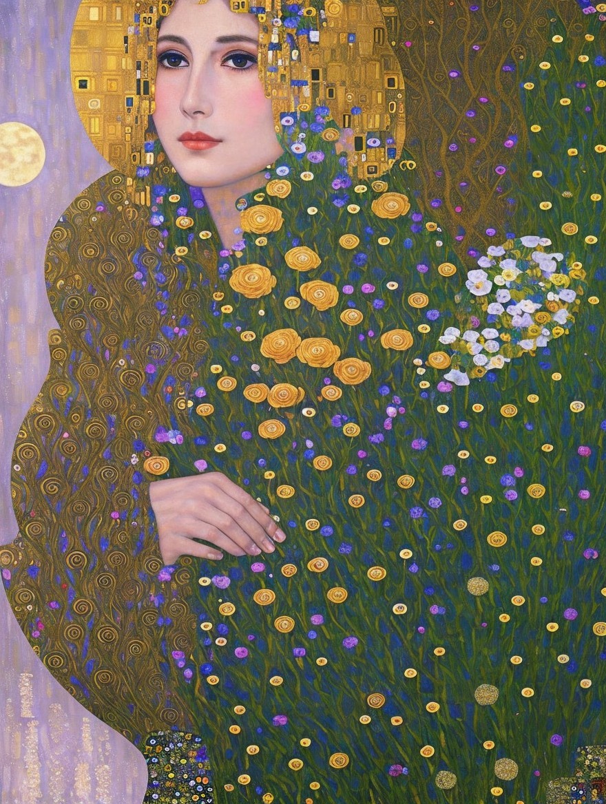 An ethereal woman with long flowing hair and ornate attire stands before a cosmic backdrop with a prominent moon.