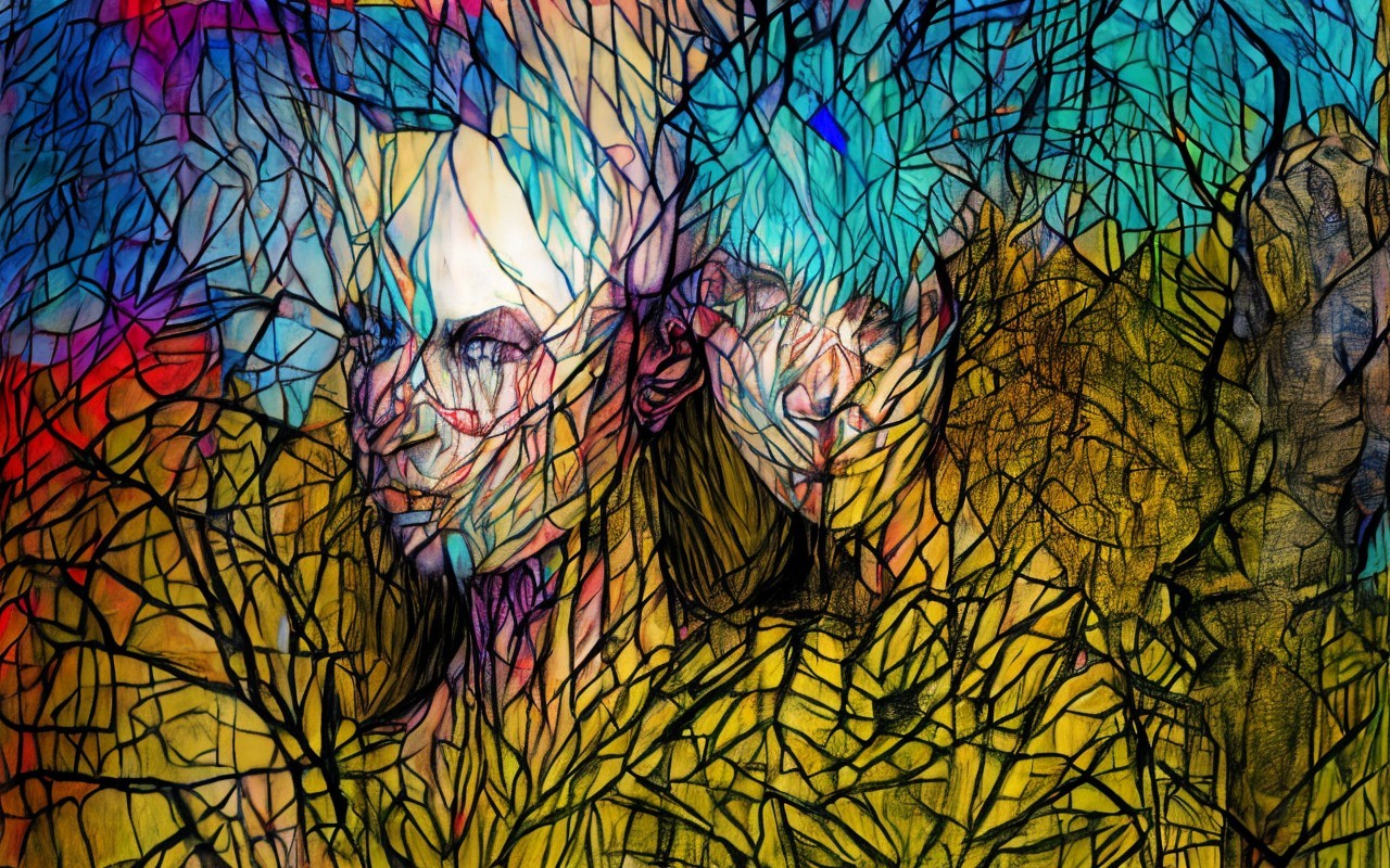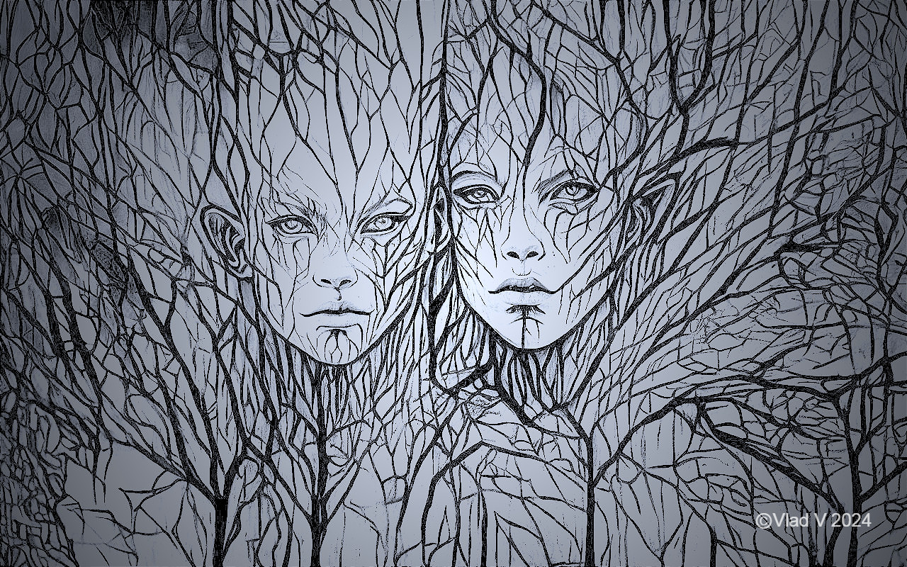 An artistic depiction of two faces blending with a network of tree branches in a grayscale palette.