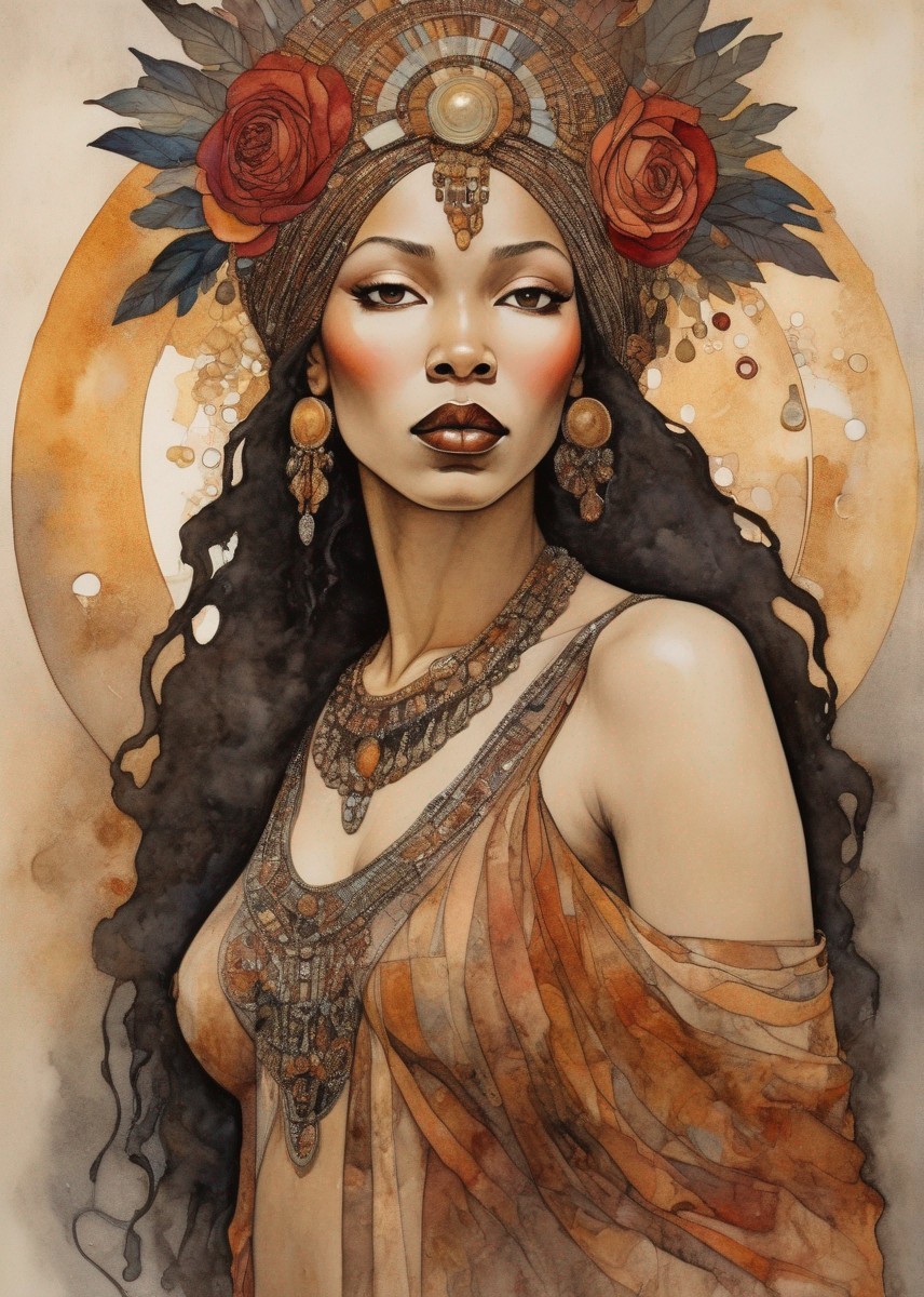 An illustrated portrait of a regal woman with an ornate headdress, intricate jewelry, and a gaze that exudes confidence.