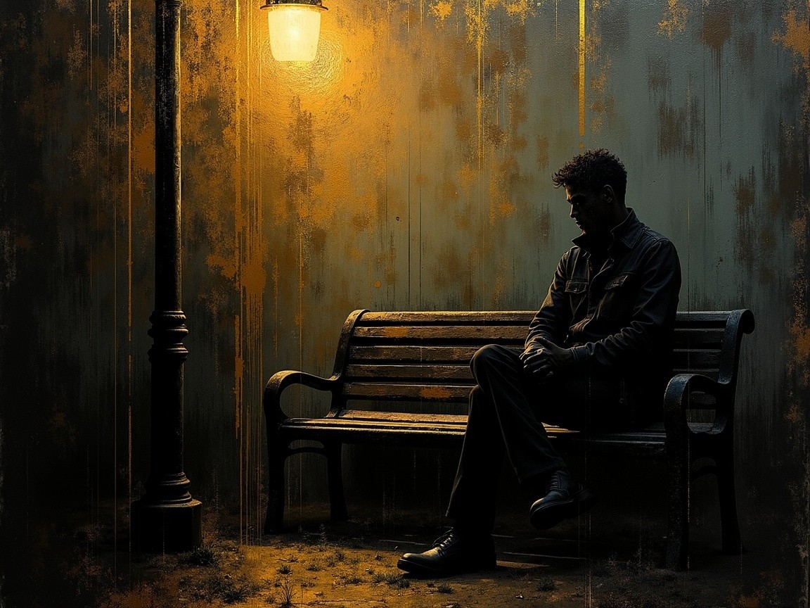 A solitary figure sits on a park bench under a warm streetlamp glow. The scene evokes a sense of contemplation and solitude, with shadows blending into a textured, moody backdrop.