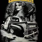 A stylish woman in a black vintage tee and fitted jeans poses next to a classic truck at sunset, showcasing a vibrant orange and yellow horizon, blending beauty with automotive nostalgia.