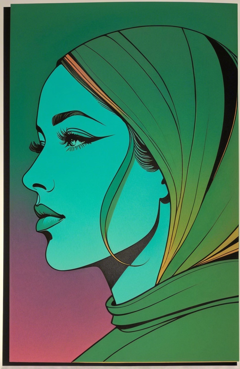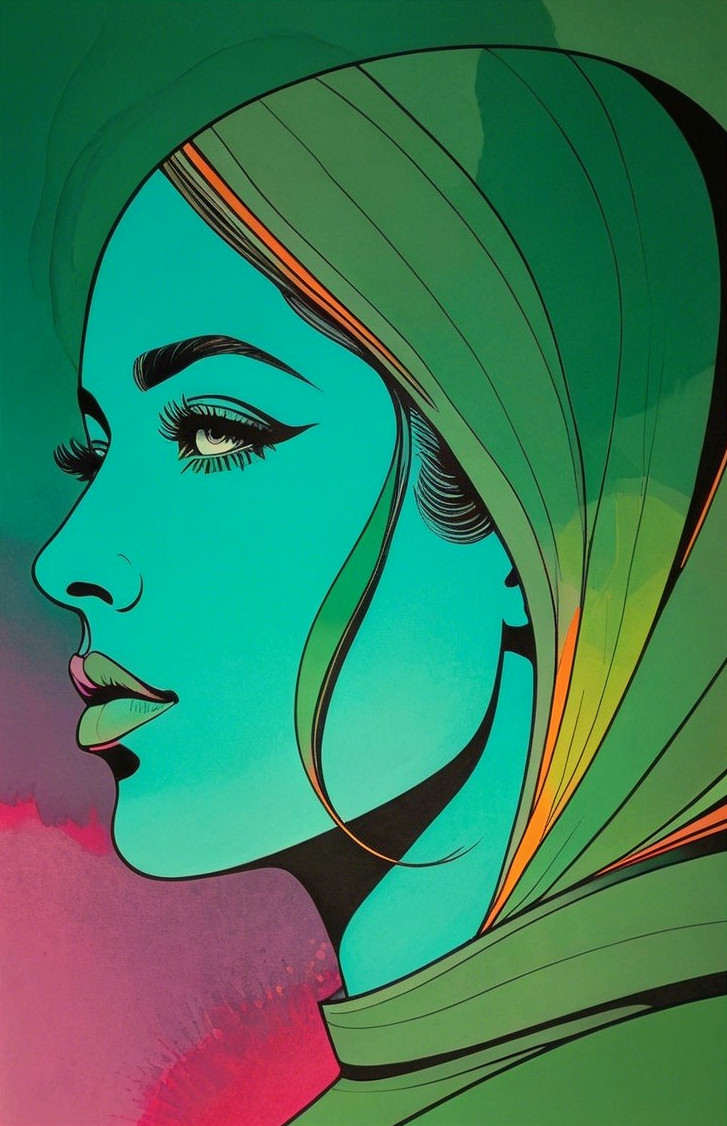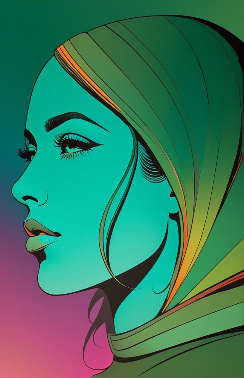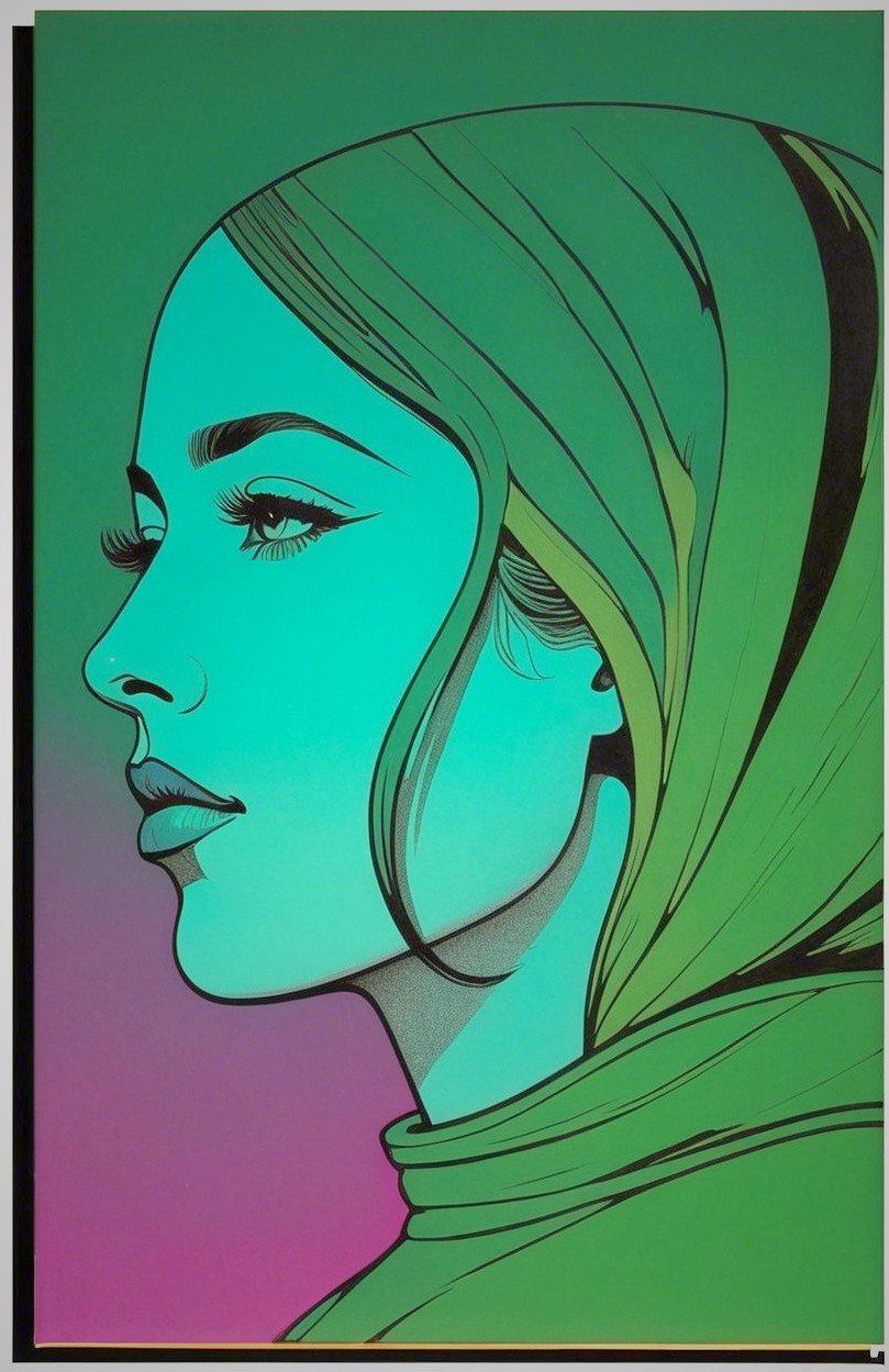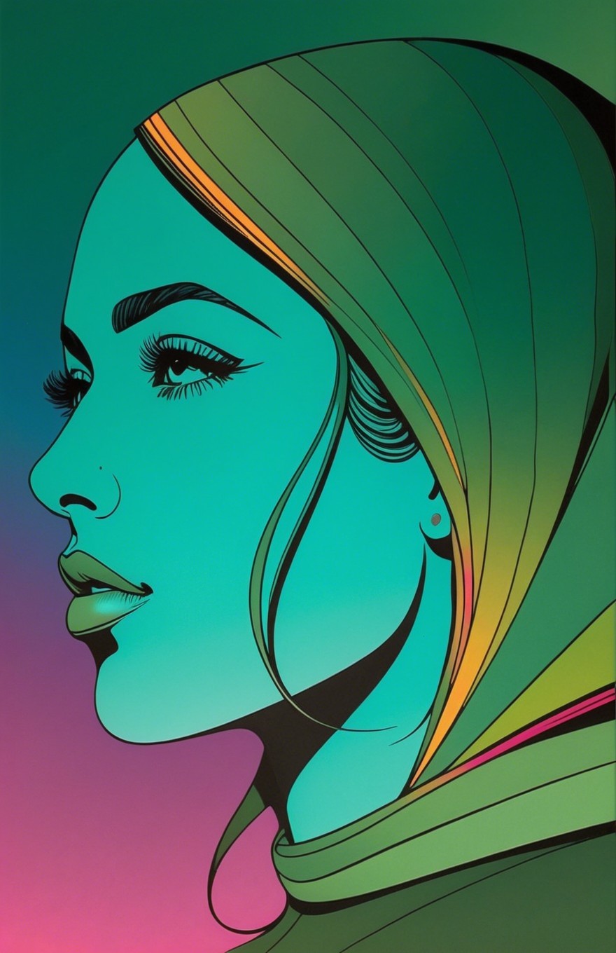 Modernist female portrait featuring wavery coloring, stylized linework, line-art with contouring outlines and micro-pen linework, complex dry ink brush outlines, curved cuts technique reminiscent of Georgia O'Keeffe's art, sci-fi, simplistic, interrelated stylization of Gerald Brom, side view, angled, streamline_moderne, reminiscent of Buckminster Fuller's style, simplistic marimekko artwork, gradient inking colors, liminal, generally scattered lines, upper body portrait, angled perspective, soft edges, blurry, vanishing, sculpted, cel-shaded, dark starfleet-blue, light-purple, light-black, black fathoms shaping, flares, embodiment by Man Ray, beautiful line-art, decent, smooth, plasticity 1.3, raytraced shadows 1.3, calm, stylish, edgy outfit, extreme variety of colors, cel-shaded, slightly sculpted, flowing hair illusion, subsurface scattering, raytraced shadows, visible textures, bokeh, --ar 1:1 --q 2 --s 750, brightened color palette, pointilism, ethereal atmosphere, layers of fabric blend with turbulent flares, liminal hues by Lotte Reininger, lighting by Ed Paschke, wavery texture patchwork, pellucid details, juminocore elements, grunge aesthetic, fusion art concept, negative lucas numbers, LiDAR point cloud, rim lighting, 1970's vintage cartoon, gradient inking in hues by Overton Loyd and Stan Lee, subtle luminism and extreme variety of colors, cel-shaded, slightly sculpted, flowing hair illusion, subsurface scattering, raytraced shadows, visible textures, bokeh, --ar 1:1 --q 2 --s 750, brightened color palette, stylized linocut print characterized by abstract coherence, curves in abstracted style, no fractalisation, intricate line-art stylization, slightly salacious, prudence, irregular pattern backdrop, Zentangle, fine-line drawing in awesome tessellated industrial design, intricately stylized linework, nuanced painterly, complex coloring reminiscent of Keith Haring's style, fine-line art, indiecore and pulp-art, angled, gradient coloring accents, wavery dappled lighting, zentangle, rim lighting, otherworldly ambiance with hatching, gradient inking in hues by Overton Loyd and Frank Miller, subtle luminism, ethereal atmosphere, layers of fabric blend with turbulent flares, liminal hues by Lotte Reininger, lighting by Ed Paschke, wavery texture patchwork, pellucid details, juminocore elements, grunge aesthetic, fusion art concept, negative lucas numbers, LiDAR point cloud, rim lighting,