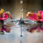 Two snails are perched on vibrant pink flowers, floating in calm water. A gentle stream of water cascades between them, creating a serene and whimsical scene.