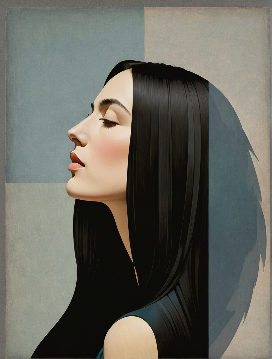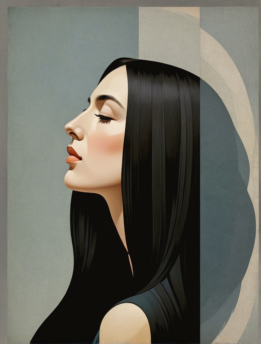 The image features a stylized portrait of a woman in profile. She has long, glossy black hair and smooth facial features, set against a muted geometric background in soft colors.