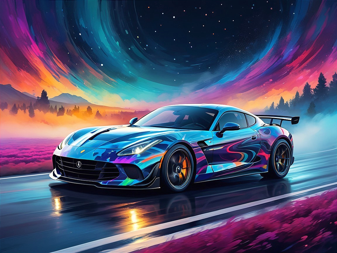 A vibrant, futuristic sports car glides down a cosmic road, surrounded by swirling colors and a starry sky. Its sleek design, bold patterns, and dynamic stance exude speed and excitement.