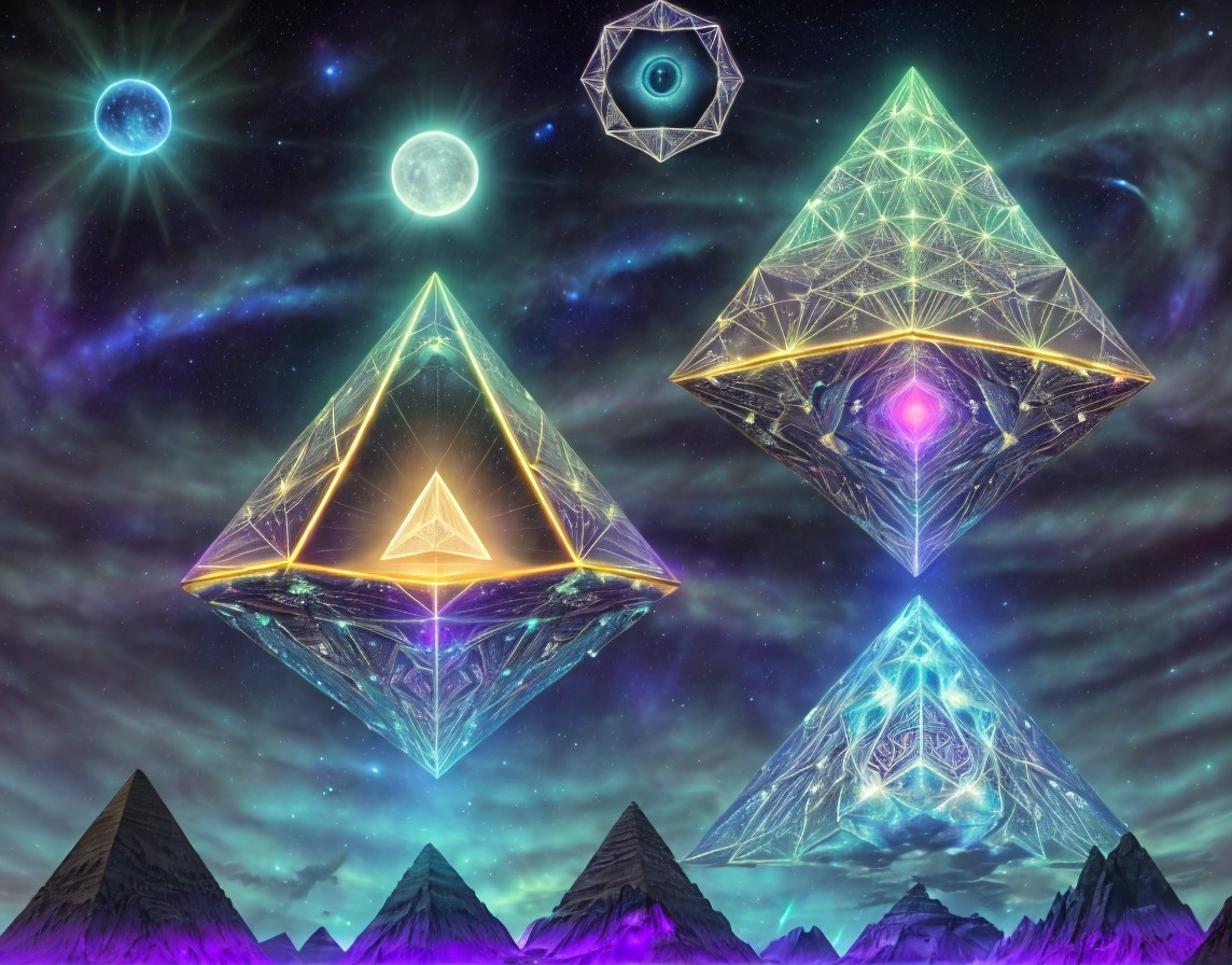 Prompt: Advanced extraterrestrial pyramid, blending high-tech features with arcane sacred geometry. Illuminated by phosphorescent runes and mineral crystals, adorned with captivating geometric patterns, including mesmerizing honeycombs. The celestial dance of the sun, moon, and planets unfolds amidst billowing nebula clouds in a vast cosmic sky. Explore an ultra-realistic landscape beneath this complex celestial canvas, immersing yourself in the enigma of astral projection, alien contact, and surreal psychedelic vibes inspired by the sci-fi LSD art aesthetic, reminiscent of Cameron Gray's distinctive style.