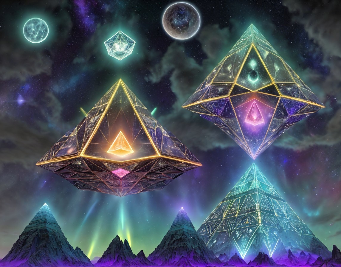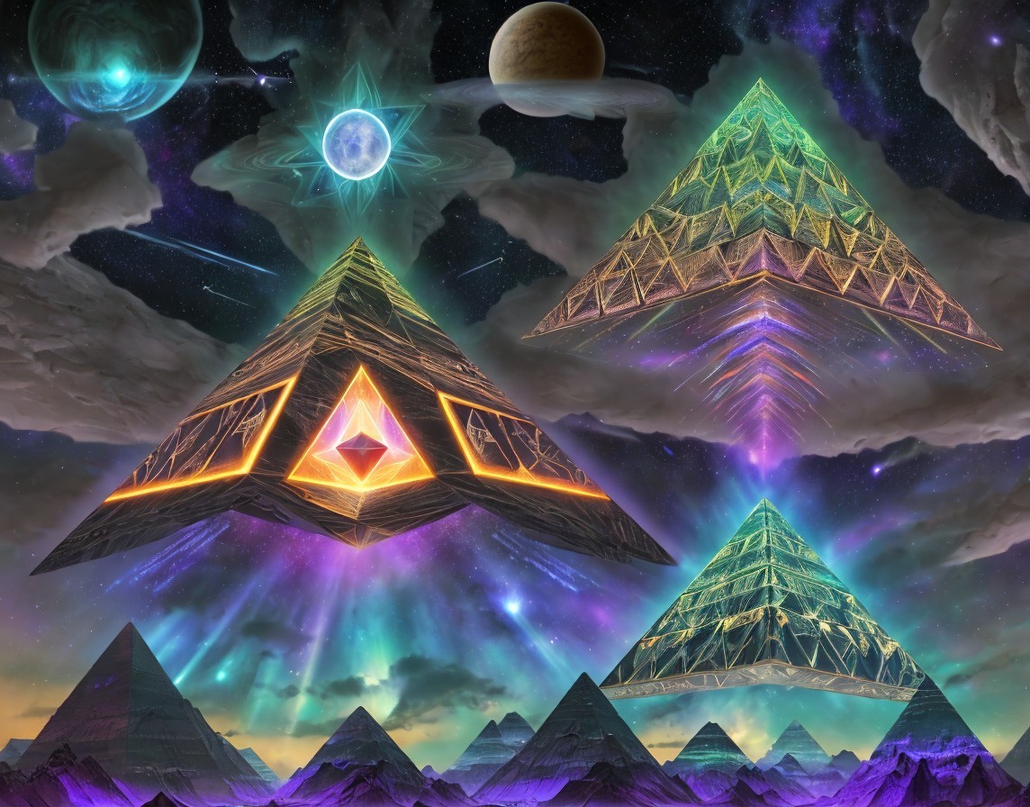 + Prompt:Advanced extraterrestrial pyramid, blending high-tech features with arcane sacred geometry. Illuminated by phosphorescent runes and mineral crystals, adorned with captivating geometric patterns, including mesmerizing honeycombs. The celestial dance of the sun, moon, and planets unfolds amidst billowing nebula clouds in a vast cosmic sky. Explore an ultra-realistic landscape beneath this complex celestial canvas, immersing yourself in the enigma of astral projection, alien contact, and surreal psychedelic vibes inspired by the sci-fi LSD art aesthetic, reminiscent of Cameron Gray's distinctive style.