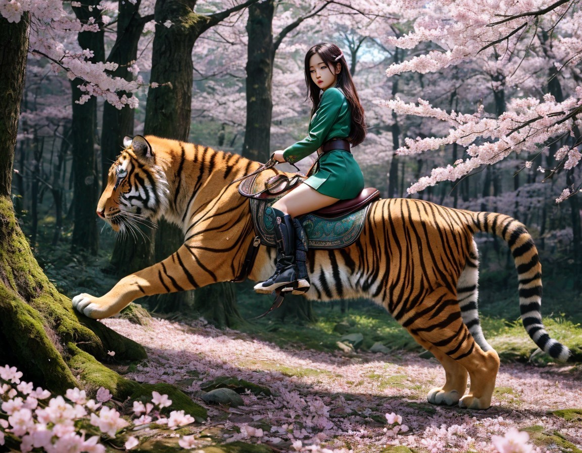A gorgeous Korean K-Pop star riding on top of a tiger.