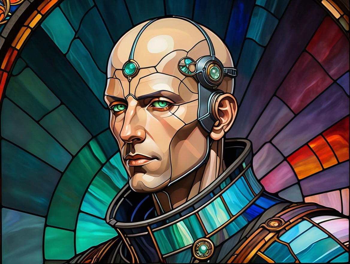 A stylized, futuristic portrait of a bald man with cybernetic enhancements, set against a vibrant stained glass backdrop. The colors blend harmoniously, highlighting his intense gaze.