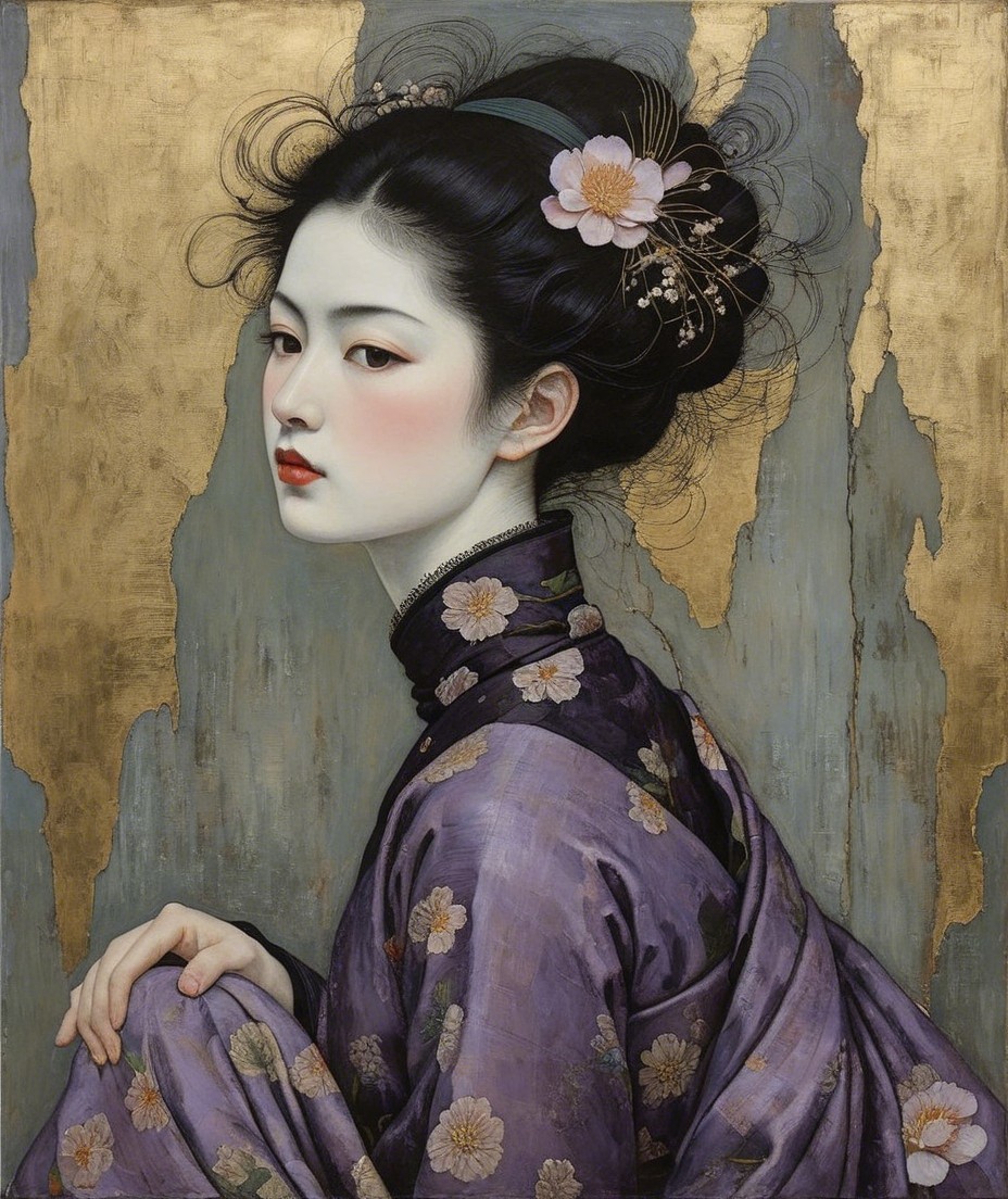 The image features a serene portrait of a woman in traditional attire, adorned with a lotus flower in her hair. She gazes softly, with elegant details in her kimono and a muted, artistic background.