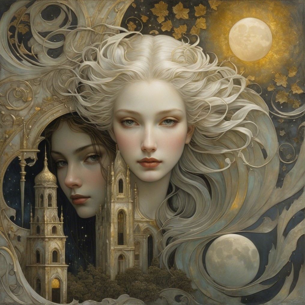 A mystical figure dances in the night sky, adorned in a purple outfit with intricate gold details. She has flowing dark hair, a crown, and elegant drapery, framed by a glowing crescent moon.