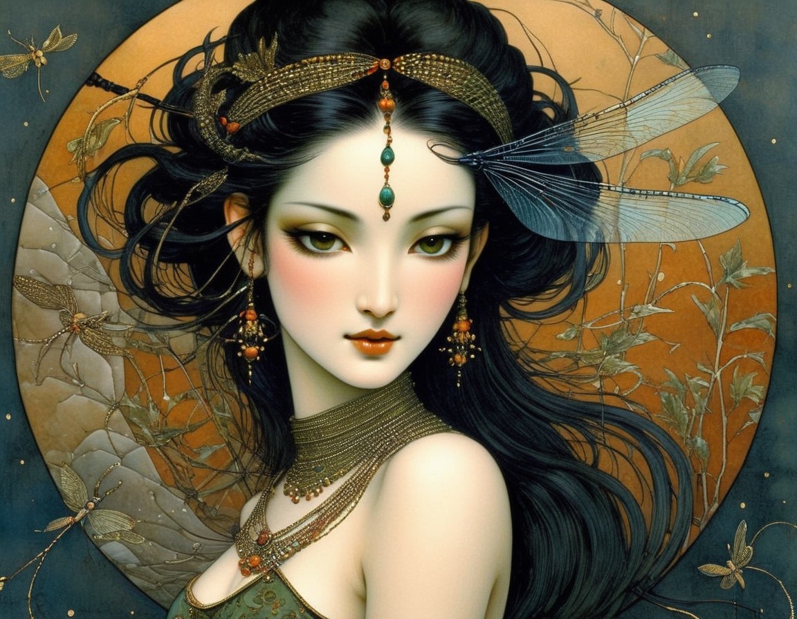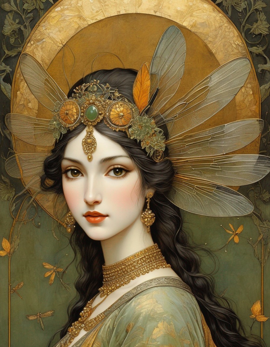 Melissae. Nymph of dragonflies. 3rd century Persian miniature art, golden ochre, silver, sage green, dark yellow, paprika, Velvet Black, Shabby, Dull Gold, Amber Gray, Golden Ratio, Surreal Fantasy, Elegant, High Definition Ultra Fine 3D Line, Zenangle Style, Watercolor Patchwork , Arthur Rackham Style, Paul Kidby, , Jacek yerka, Extremely Detailed, Intricate, Thoughtful, HDR, Fractal, Beautiful, Award Winning, Fantasy Look, Fantasy, Crisp Quality
