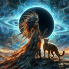 A mystical scene features a figure adorned in intricate attire with a feathered headdress, standing beside a big cat. They gaze at a cosmic backdrop of swirling galaxies and a majestic ringed planet.