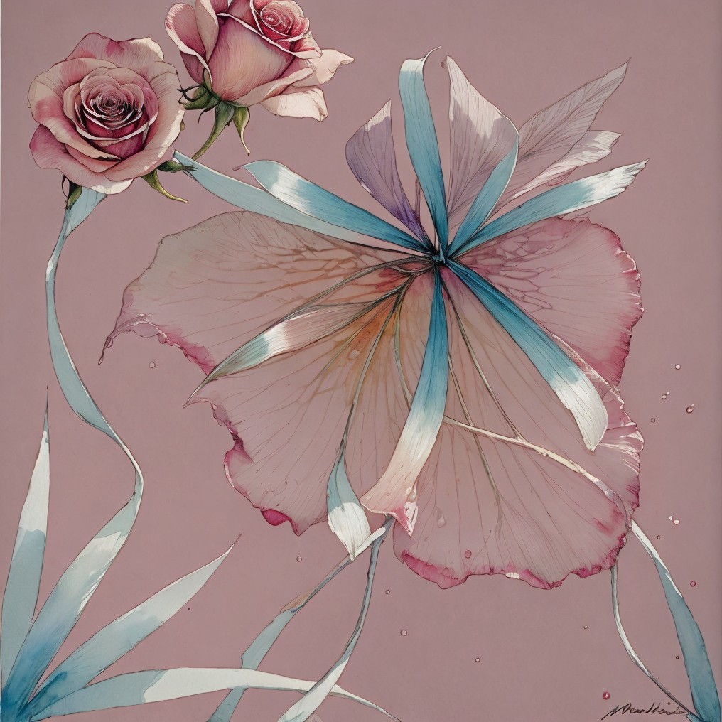 + Prompt:alcohol ink on textured paper, soft textures, dynamic ink lines, washed ink, nuanced colors, vignette, illustration of a beautiful rose, whimsical and charming illustration, art by MSchiffer and jean baptiste monge. Detailed, soft colors, pop art