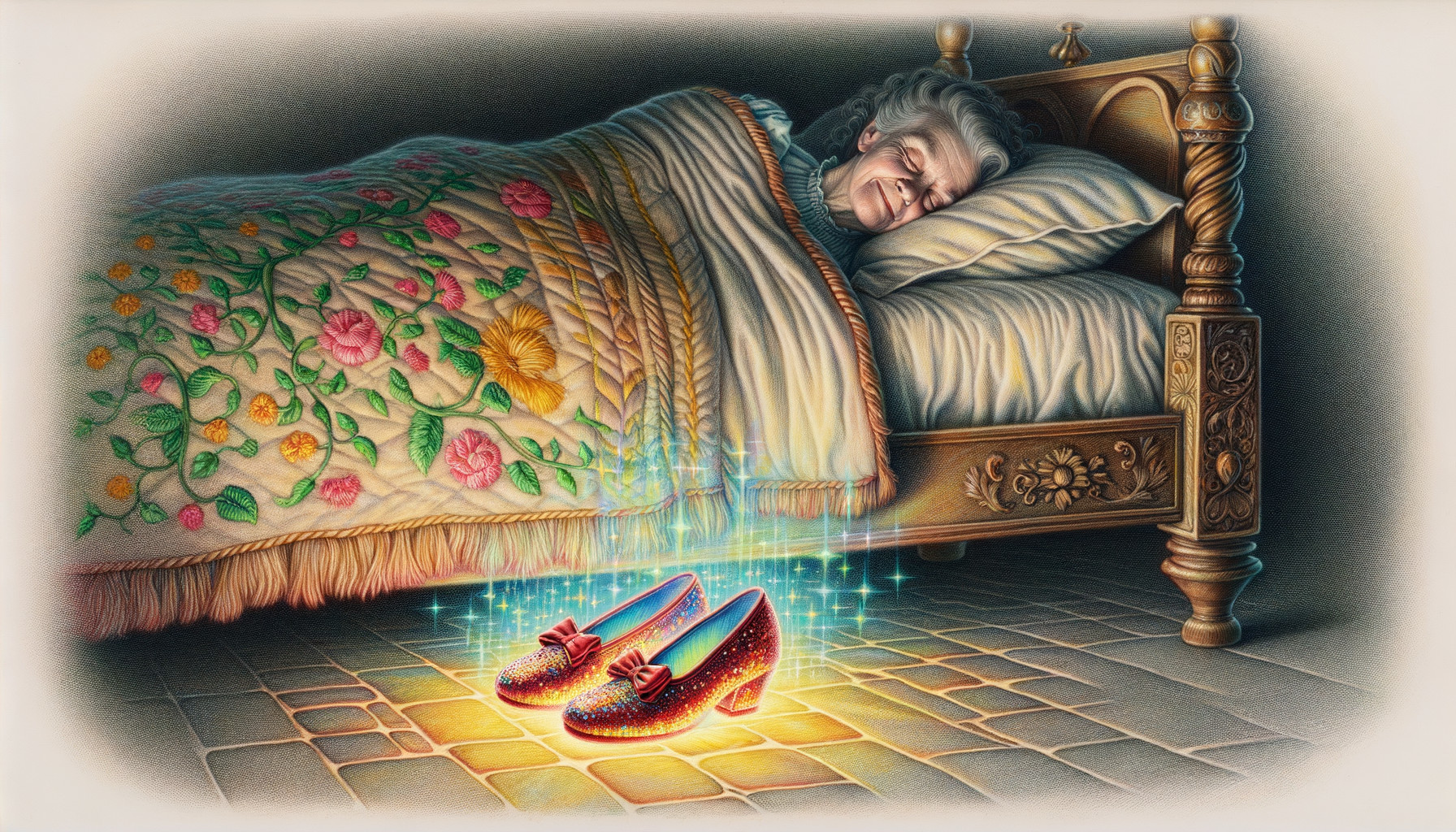 A low angle intimate view of ruby slippers under an old bed, the slippers are glowing with magic, in the bed above an elderly woman's profile can just be seen, she is sleeping with a contented soft smile, her blanket has an embroidered border of a Yellow Brick Road; the whole image is crisp in textural detail, but soft with magical realism and fantasy, in the style of Charles Santore and Gred Simkins; high quality, centered, perfect composition, pencil drawing, beautifully rendered fine details and textures, iridescence and soft colors except for the vividly glowing Ruby Slippers beneath the bed.