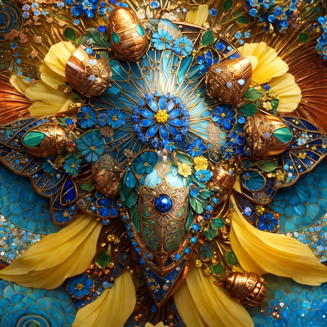 + Prompt:bees sitting on a flower, macro shot, they collect pollen from flowers and themselves in pollen, art nouveau masterpiece with copper and sapphire highlights uchiwa ca, 1918 in the style of gust klimt vienna secession symbolism dazzling color, ocean green and blue