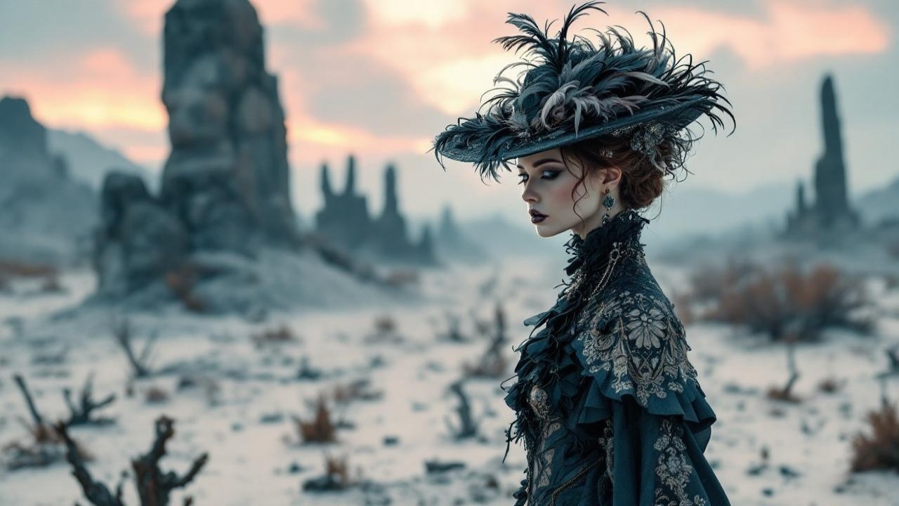 A woman in an ornate, feathered hat and an elegant dark dress stands against a surreal, desolate landscape, with towering rock formations and a moody sky at dusk.