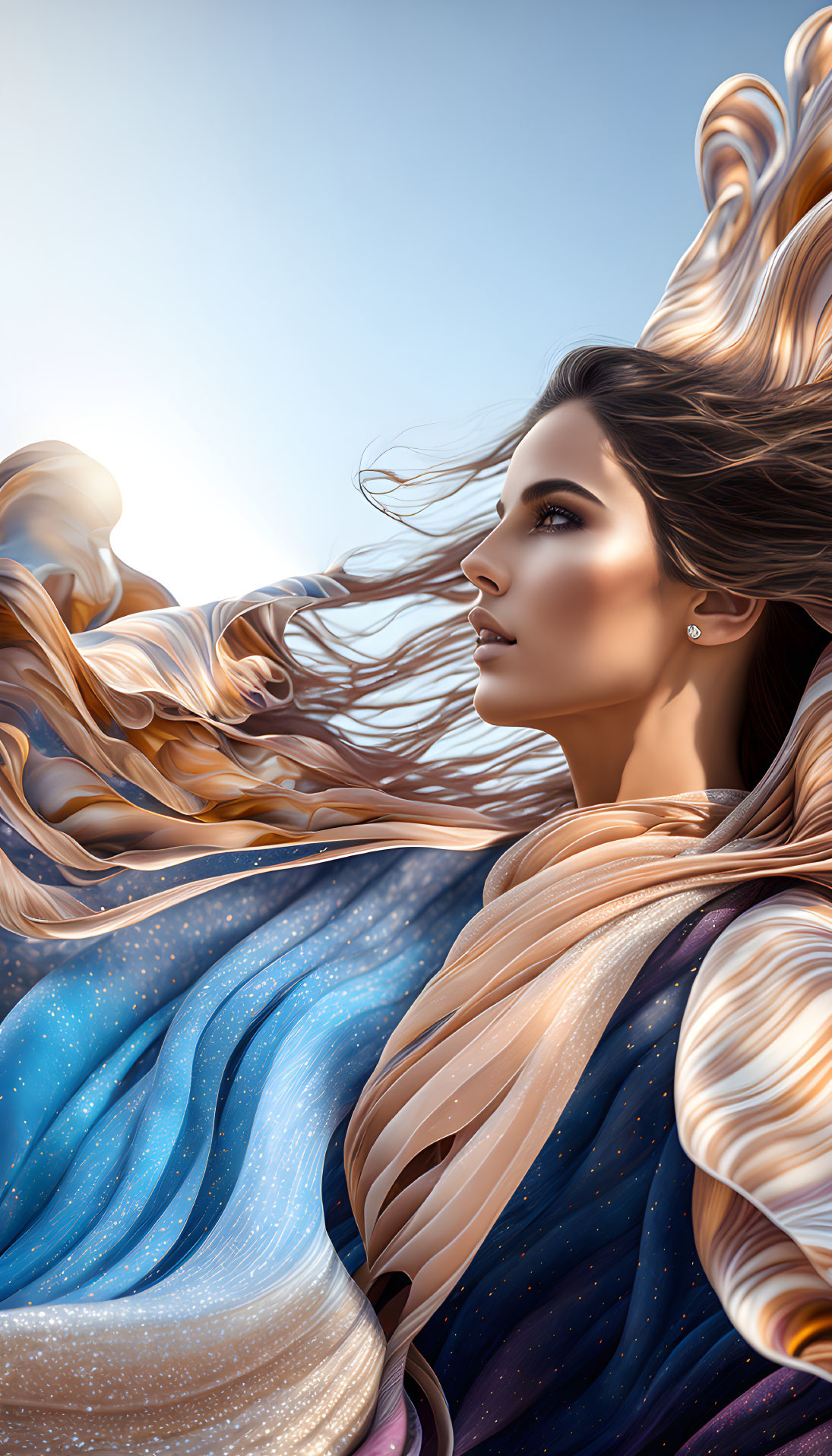 Prompt: photo realistic depiction of anatomically & aesthetically beautiful woman, an array of sublimely designed & textured scarves blowing in the wind cling to contours of subject's head & body,, & swirl around transforming her into a sensuous work of art with the scarves billowing into a glorious spherical artistic structure of silks around & behind her, Santiago Calatrava influences, overall exquisitely detailed, flawless anatomy from head to toe, powerful imagery, elegant, extremely intricate, precise, beautiful, exquisite textiles, patterns, detailing, motifs, tracery, movement, styling with high architectural structure elements & intricate detailed textures, 8k UHD, innovative, line art, fine art, figurative art, , high resolution, clear, deep brilliant colors, excellent composition with ai art generated effects that significantly enhance the overall aesthetics resulting in a realistic surrealism, ethereal yet sharp in the styles of Pino Daeni & Tom Bagshaw & Catrin Welz-Stein & Santiago Calatrava & Anthony Gerace
