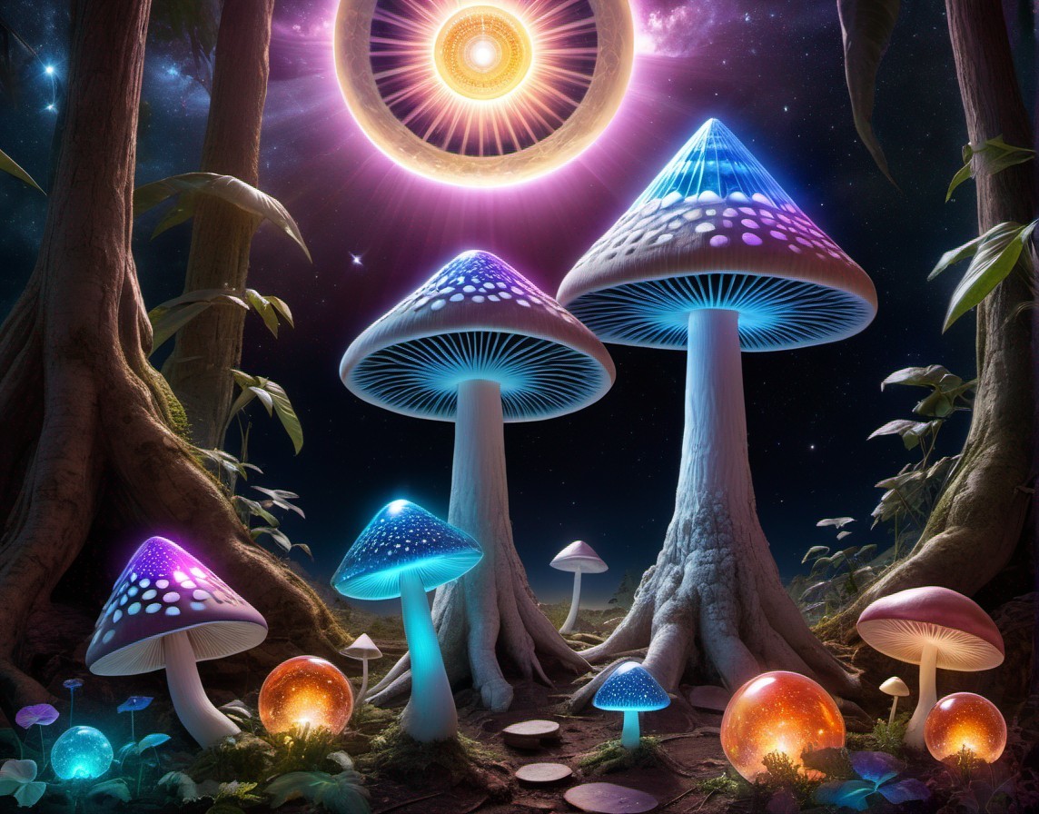 + Prompt:3D Deep dream psilocybin mushrooms and giant crystals. Time traveling alien alchemist using magic. Sacred geometry, mystical occult, hamsa, eye of providence, all seeing eye, talisman, esoteric, tarot, psychic pagan occult. pyramid sun and moon. Astral projection, alien standing in front of a mushroom, trippy mushroom, cosmic, psychedelic psilocybin, galactic dmt entity, hallucinogen, shamanic horror lsd art, dmt realm, psychedelic mushrooms, beautiful fantasy landscape, realistic and natural, cosmic sky, realistic surrealism, elements by nasa, magical, alien plants