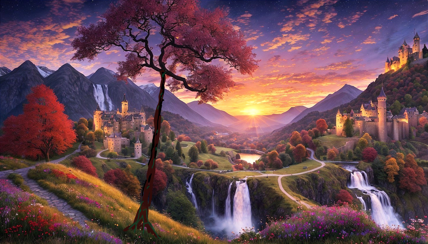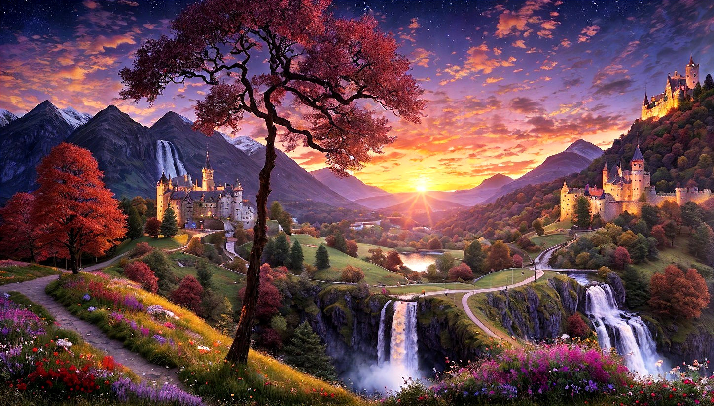 + Prompt:highland landscape in mountains, red and purple glorious sunset, burning fire and red sun, castle in marble, castle, sHINING metal structure, pyramid, absurdism, nice waterfalls and a beautiful tree and path, bridge over waterfalls, some flower details by Gustav Klimt , elegant fantasy, intricate beautiful wallpaper ,colourful, Van Gogh, stained glass and metallic paints