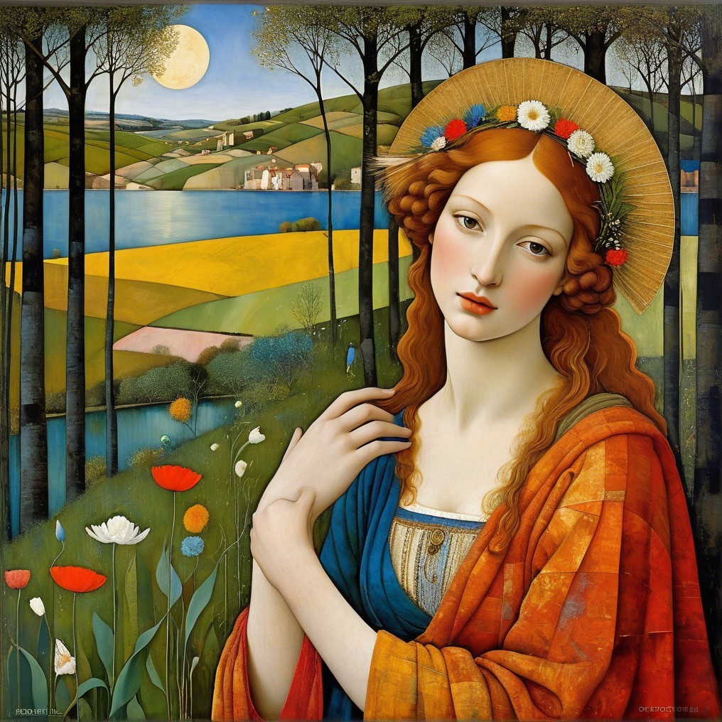 A serene woman in vibrant attire adorned with flowers gazes thoughtfully. She stands amid lush greenery and colorful flowers, with a tranquil lake and rolling hills in the background under a glowing moon.