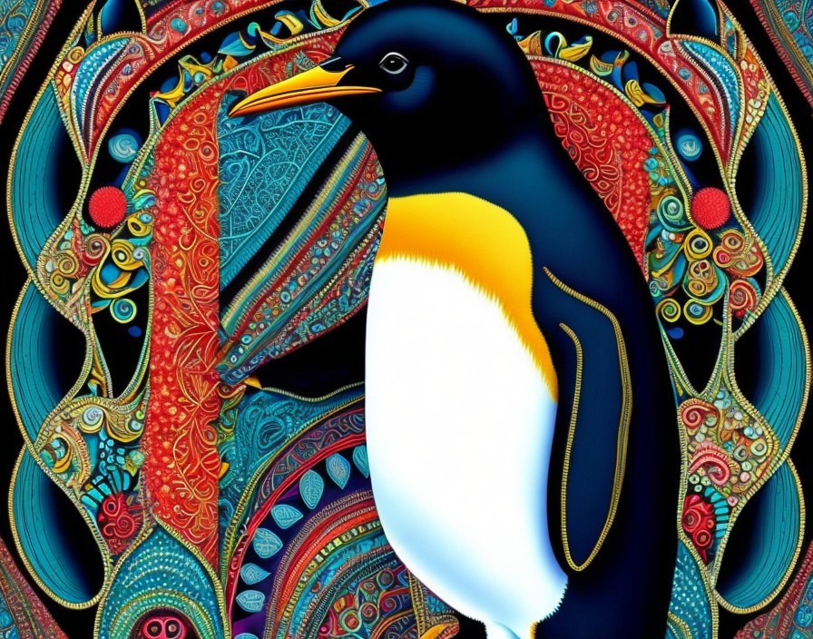 Colorful Penguin Illustration with Paisley and Peacock Feather Background