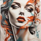 The image features a close-up portrait of a woman with tousled blonde hair and striking features. Her glossy lips are bright red, and her expressive eyes draw attention, set against an abstract background. Base dream is a SiouX original.