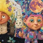 Whimsical Artwork with Colorful Figures and Celestial Motifs