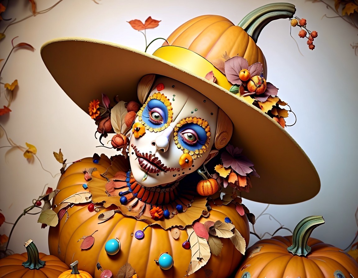 Vibrant Figure with Yellow Hat and Sugar Skull Makeup