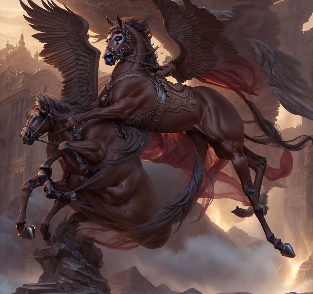 A majestic warrior on a powerful horse, clad in ornate armor and adorned with wings. The backdrop features grand architectural elements, evoking a sense of ancient mythology and strength.