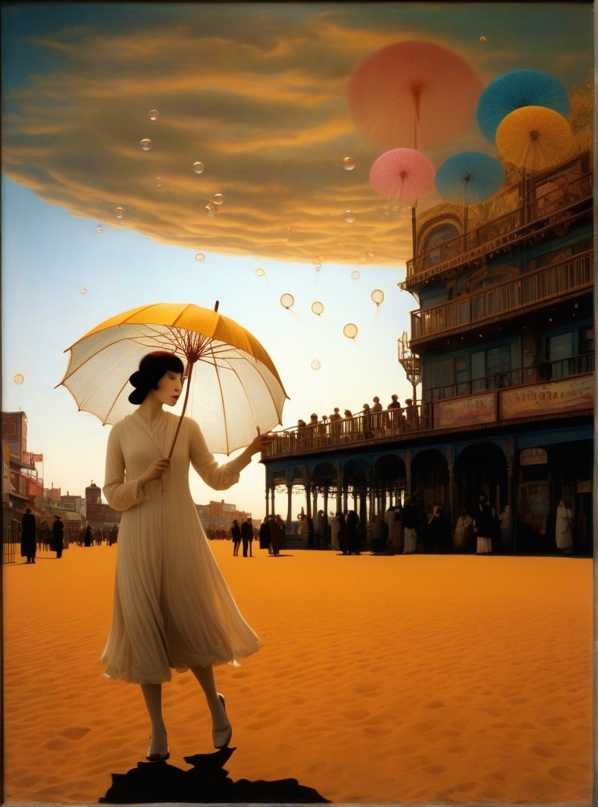 A woman in a flowing yellow dress walks along a beach, holding a pink umbrella. Colorful umbrellas float overhead, casting a dreamy, whimsical atmosphere against a vintage seaside backdrop.